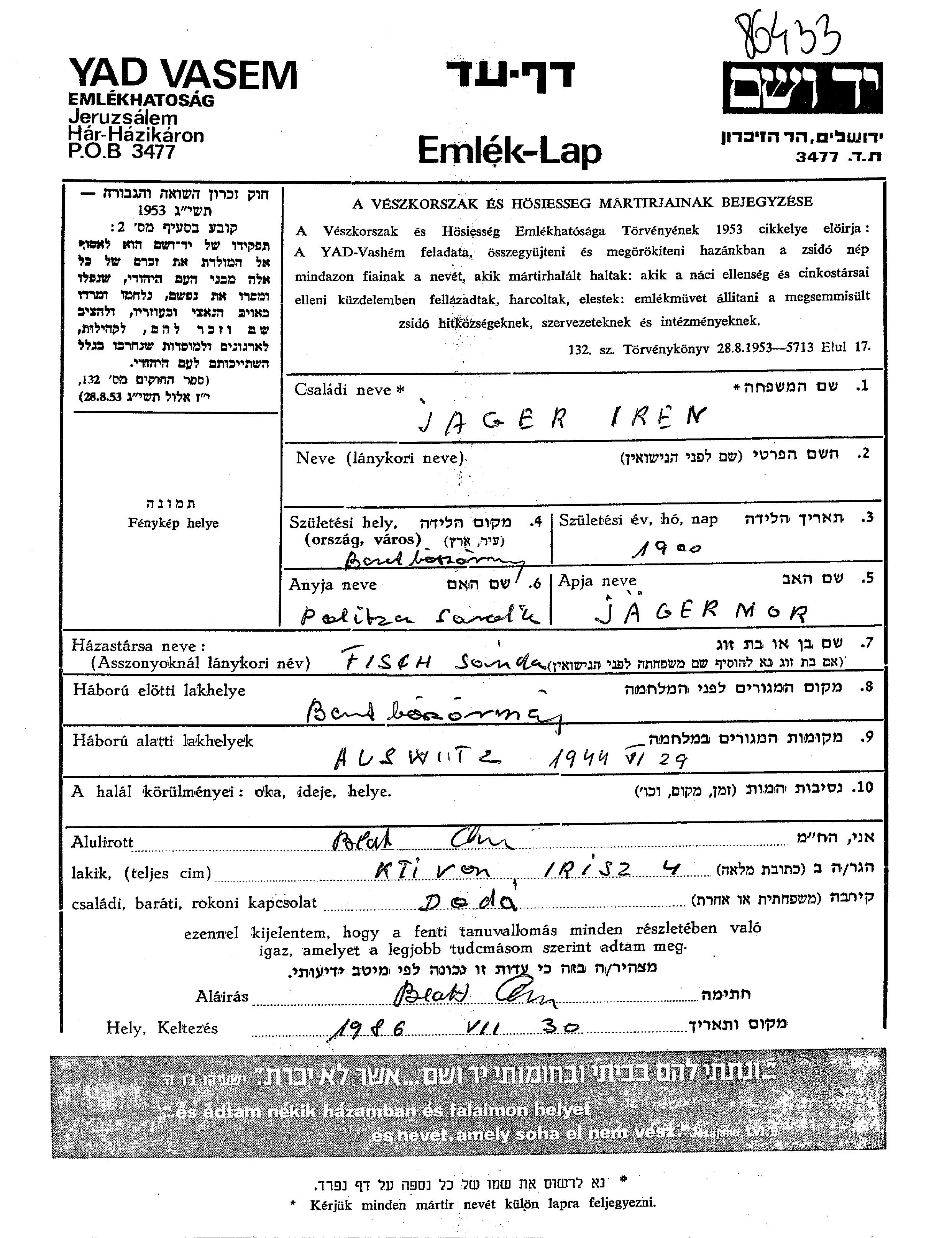 Iren Jager Fisch née Jaeger est née à Berekboszormeny, Hongrie en 1900. Elle était Négociant en plumes. Avant la seconde guerre mondiale elle vivait à Berekboszormeny, Hongrie.