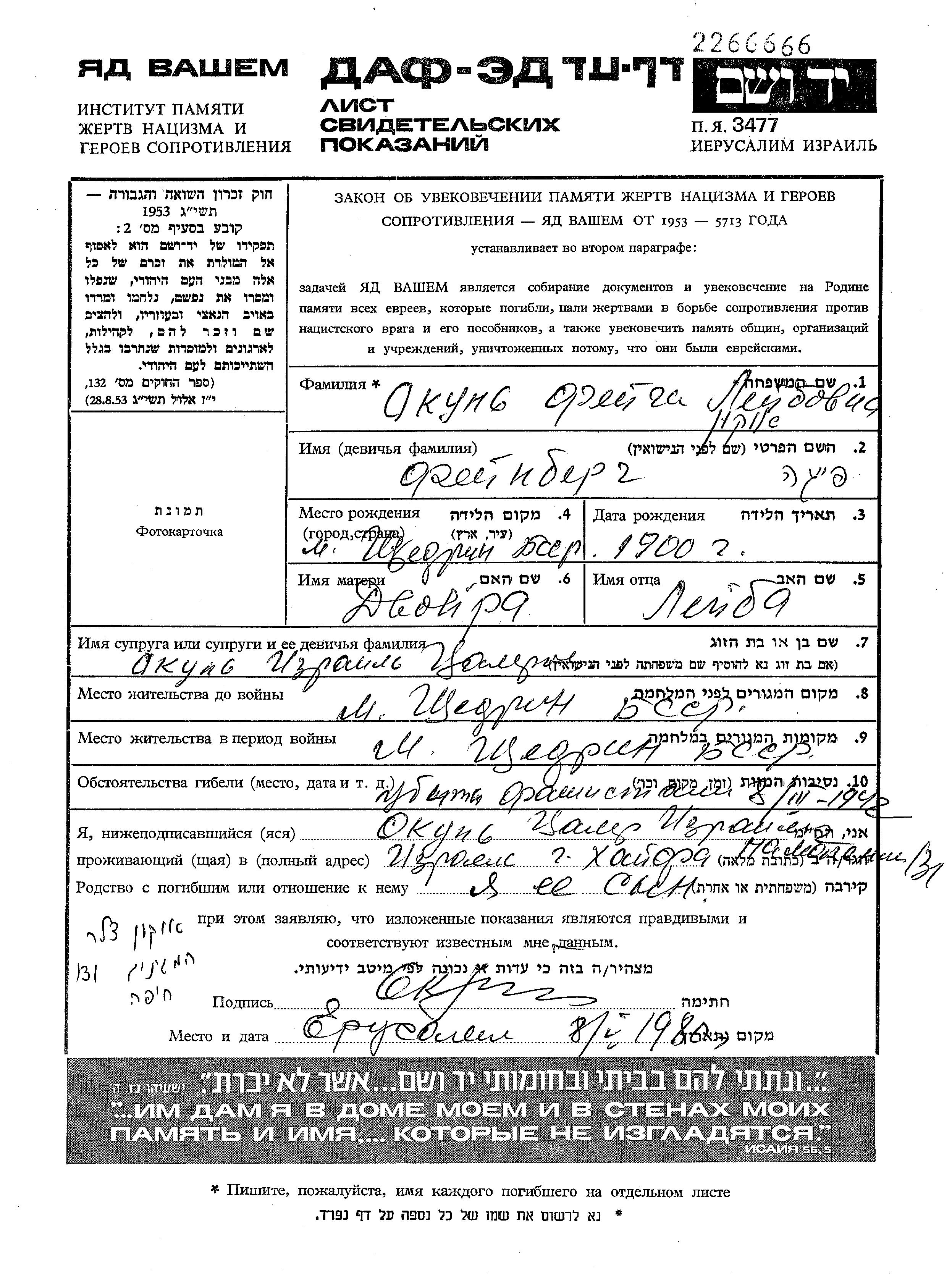 Okun | Feigel | 1900 | Shchedrin, Bélorussie (URSS) | Feuille de témoignage |