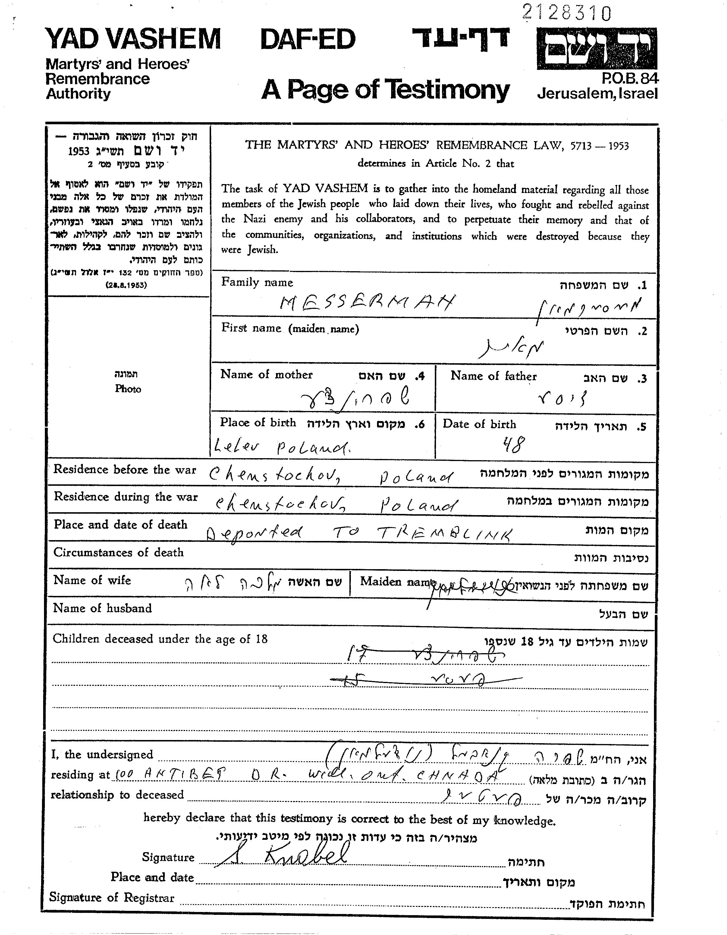 Messerman Meir Czestochowa, Pologne Feuille de témoignage
