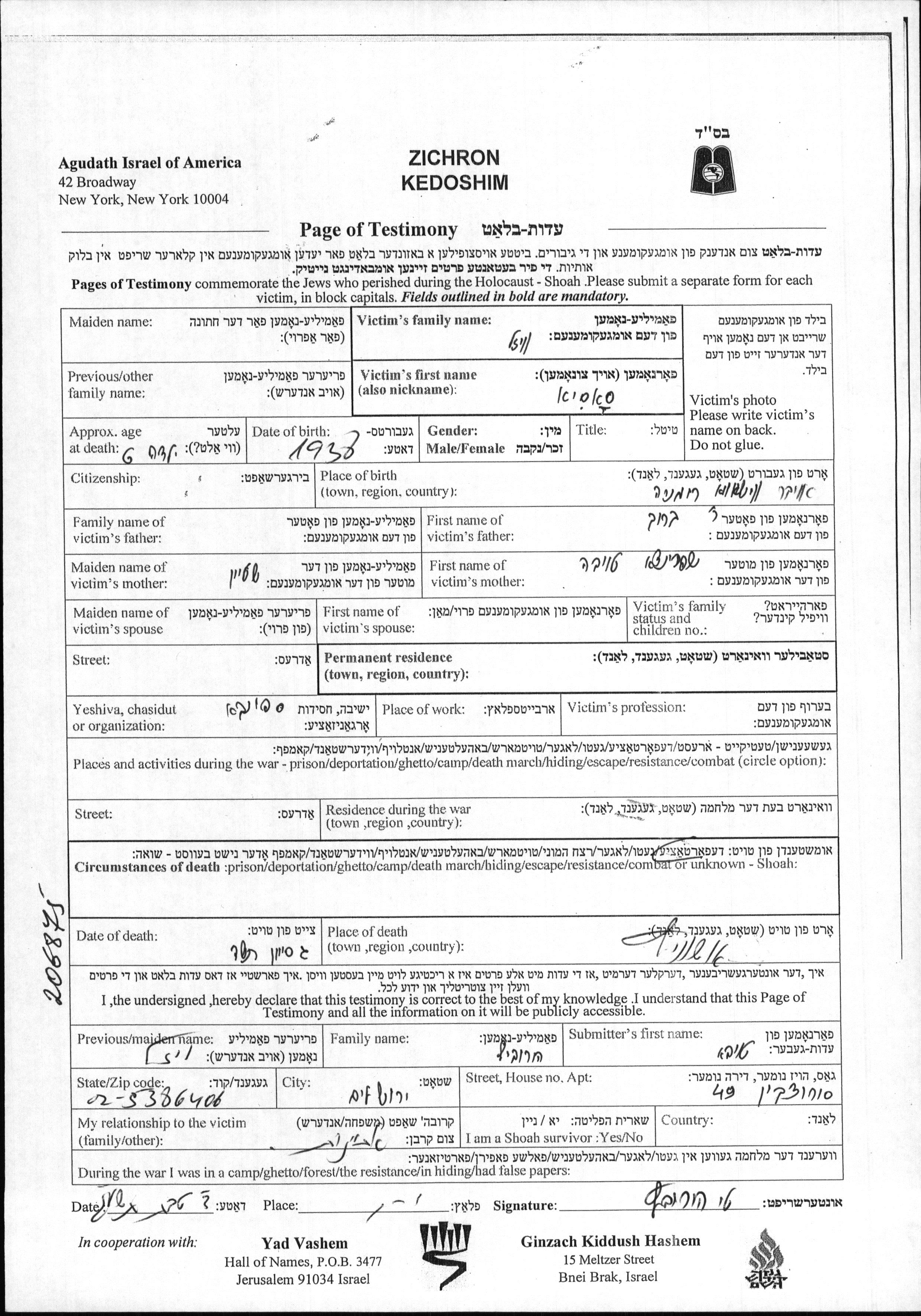 Yad Vashem - Pages of Testimony Names Memorial Collection