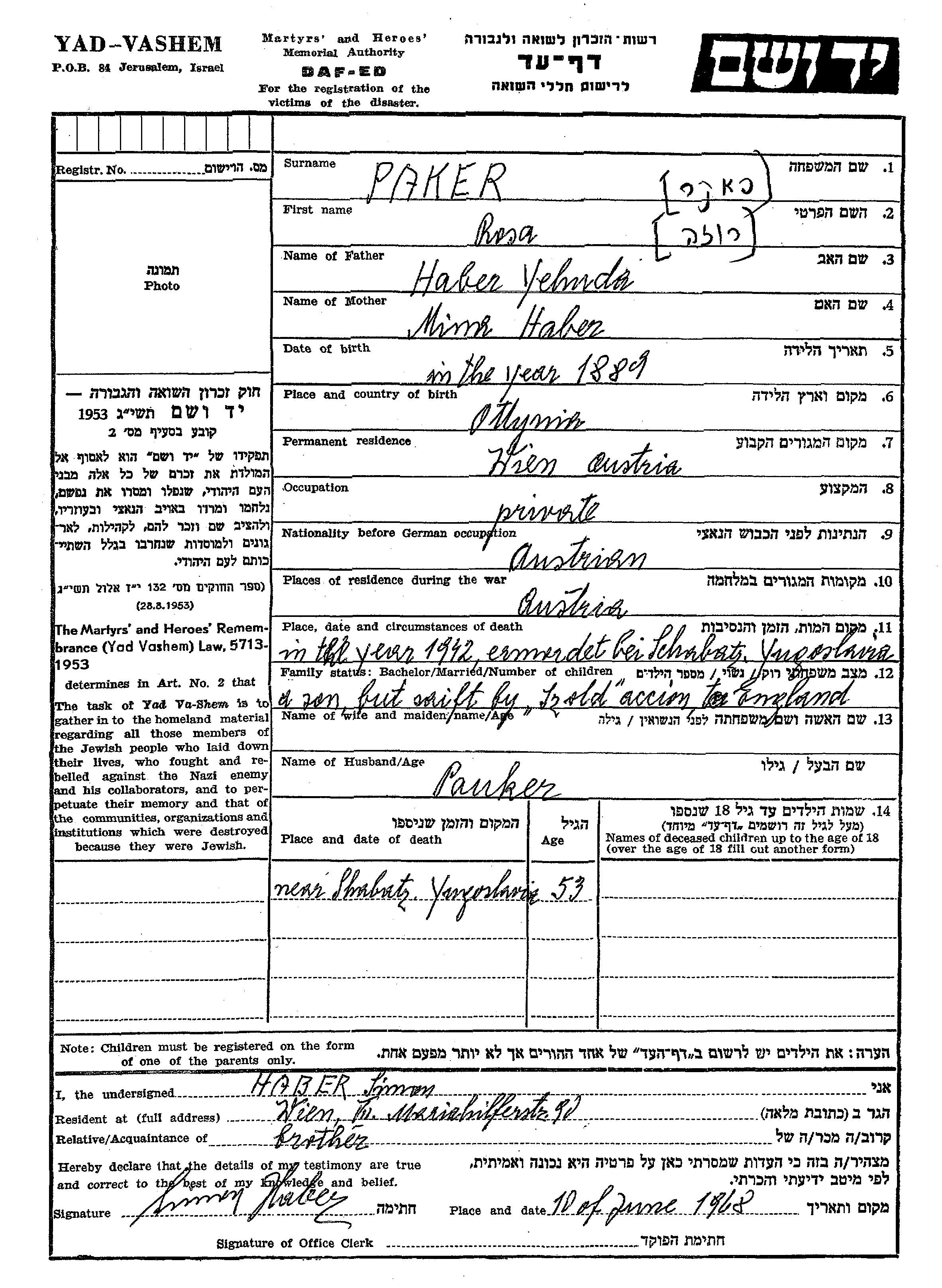 Pauker | Rosa | 1889 | Wien, Autriche | Feuille de témoignage |