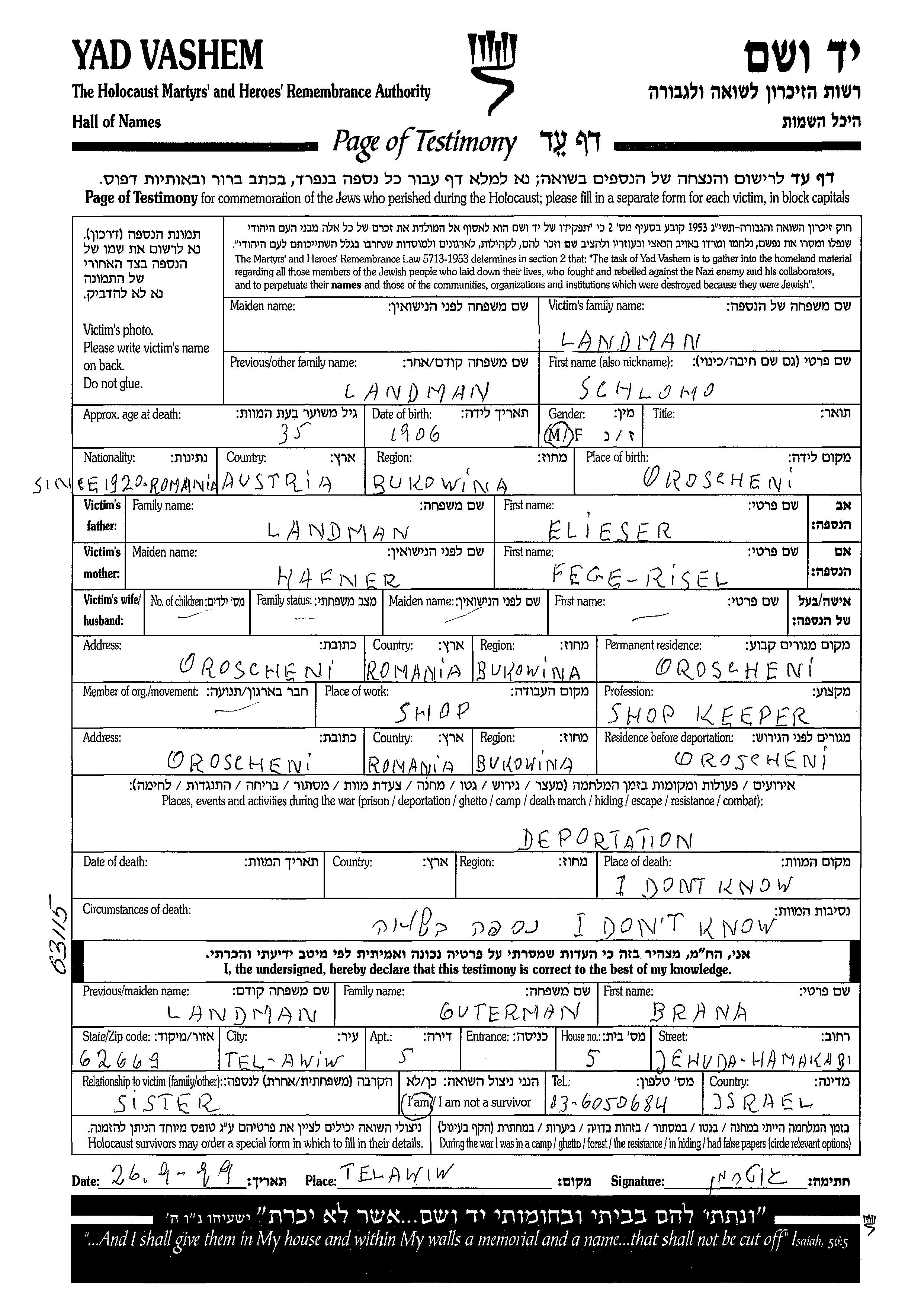 Landman Schlomo 1906 Orosani, Roumanie Feuille de témoignage