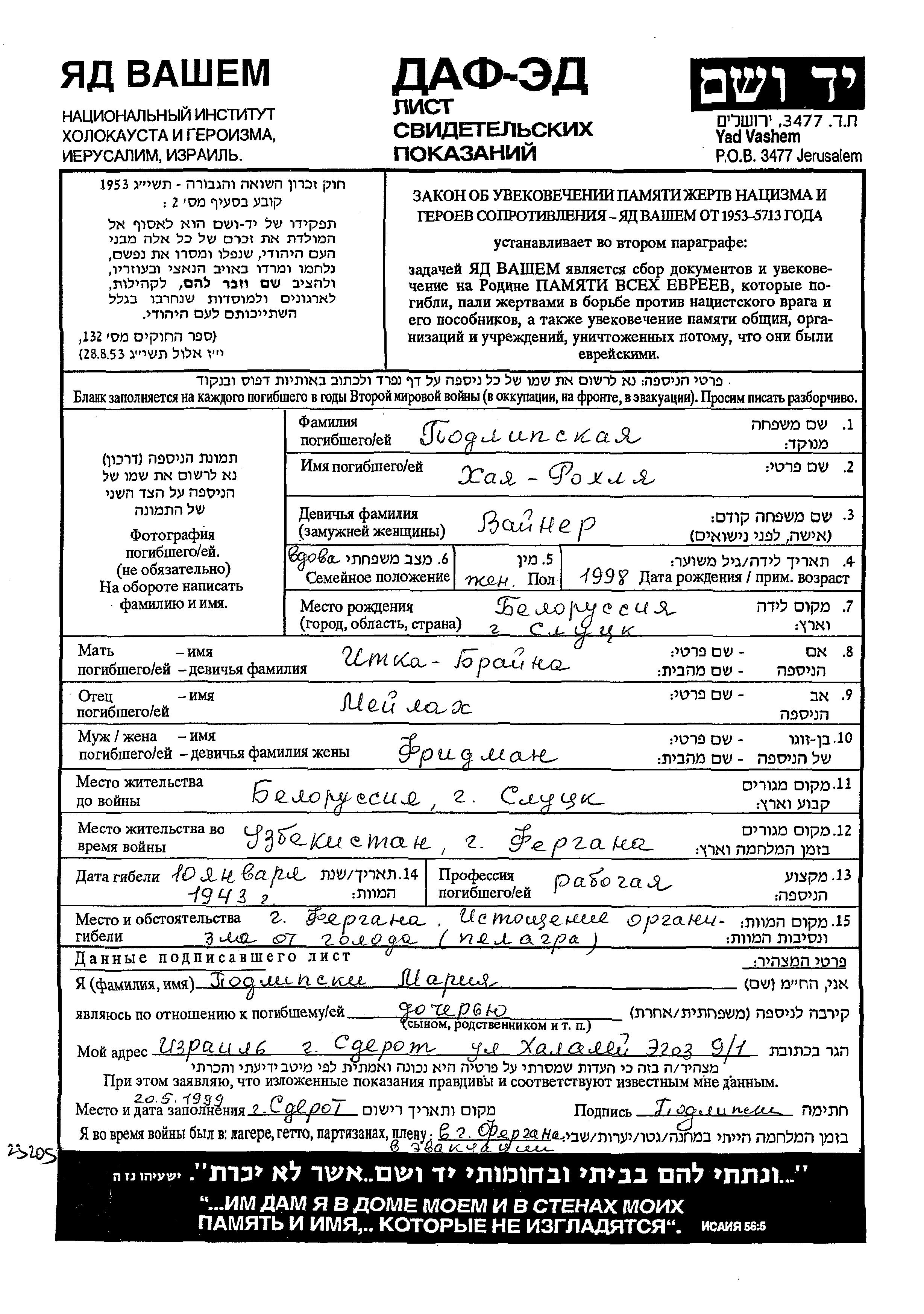 Podlipski | Khaia Rokhlya | 1898 | Sluck, Bélorussie (URSS) | Feuille de témoignage |