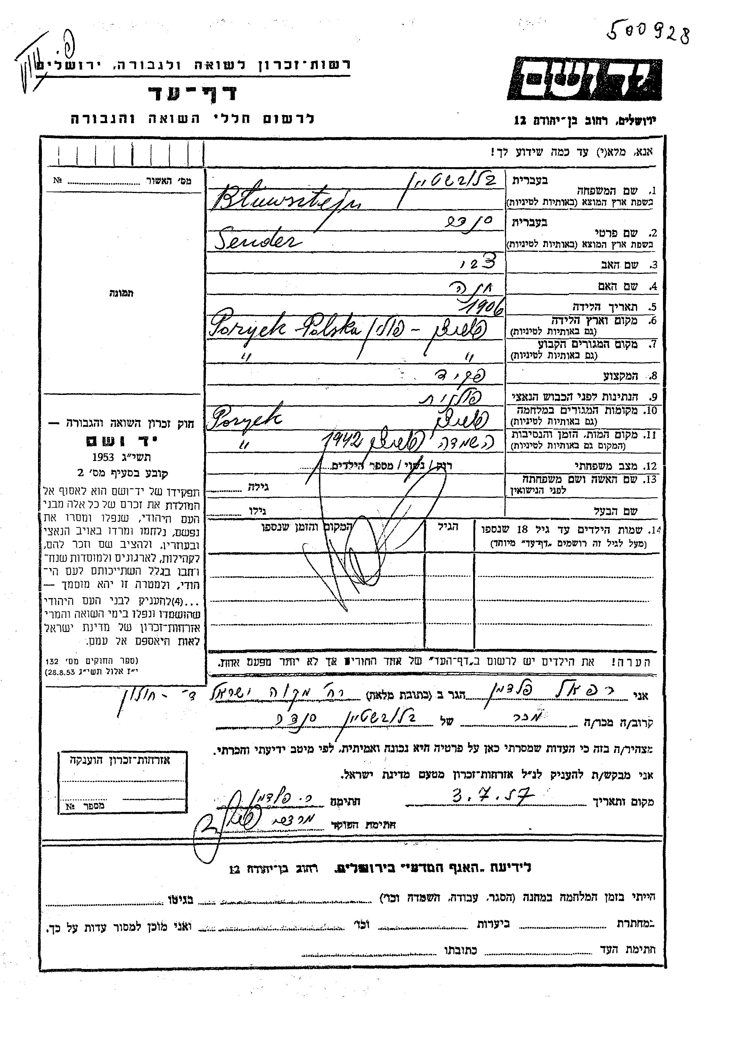 Bluwsztejn | Aleksander | 1906 | Poryck, Pologne | Feuille de témoignage |