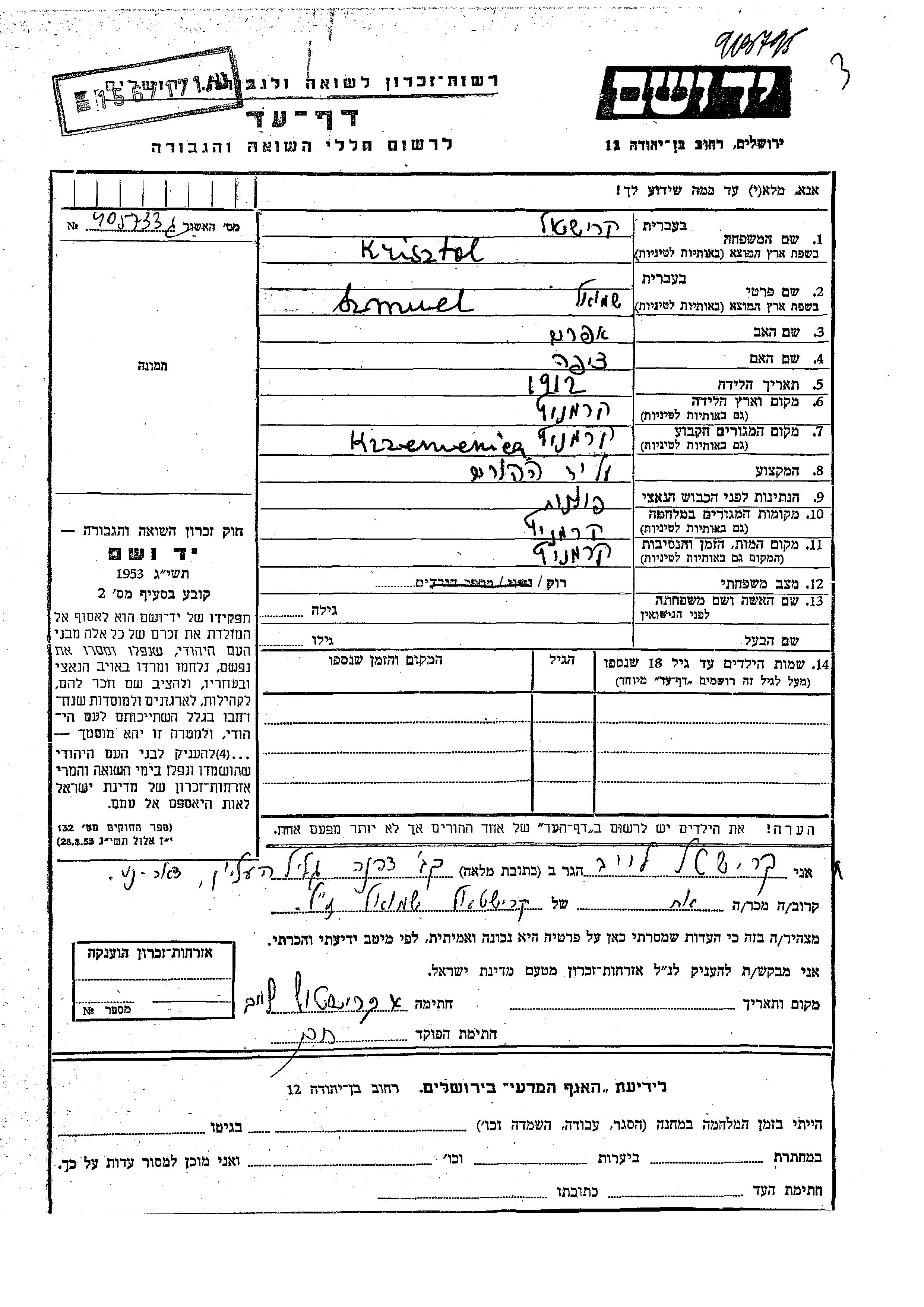 Krisztol | Szmuel | 1912 | Krzemieniec, Pologne | Feuille de témoignage |