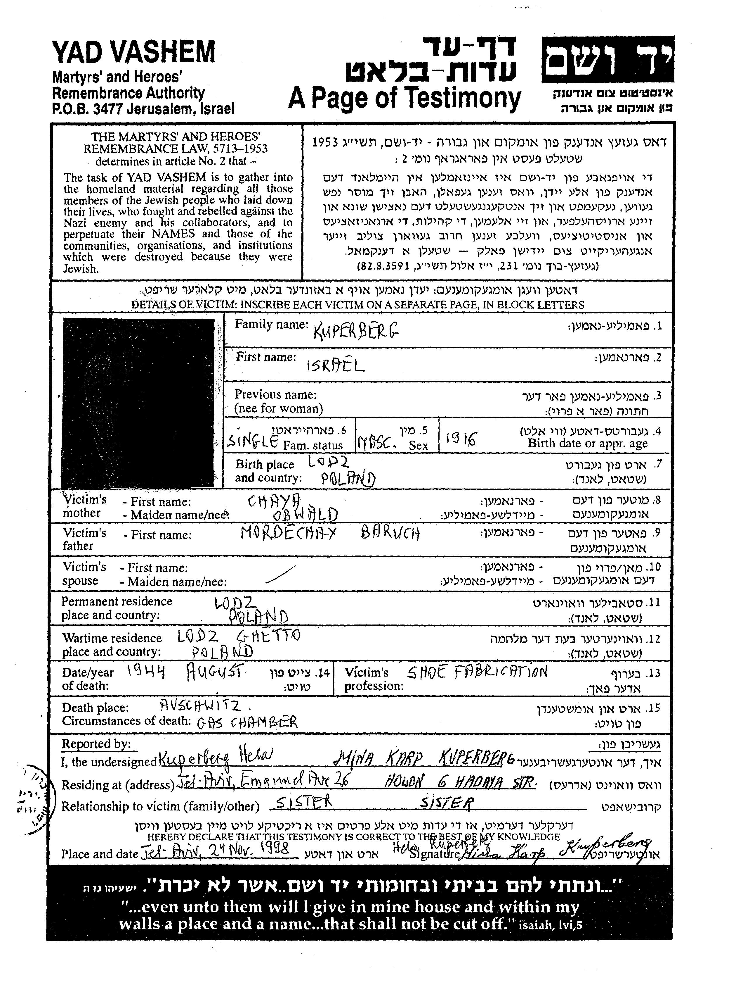 Kuperberg Israel 1916 Lodz, Pologne Feuille de témoignage