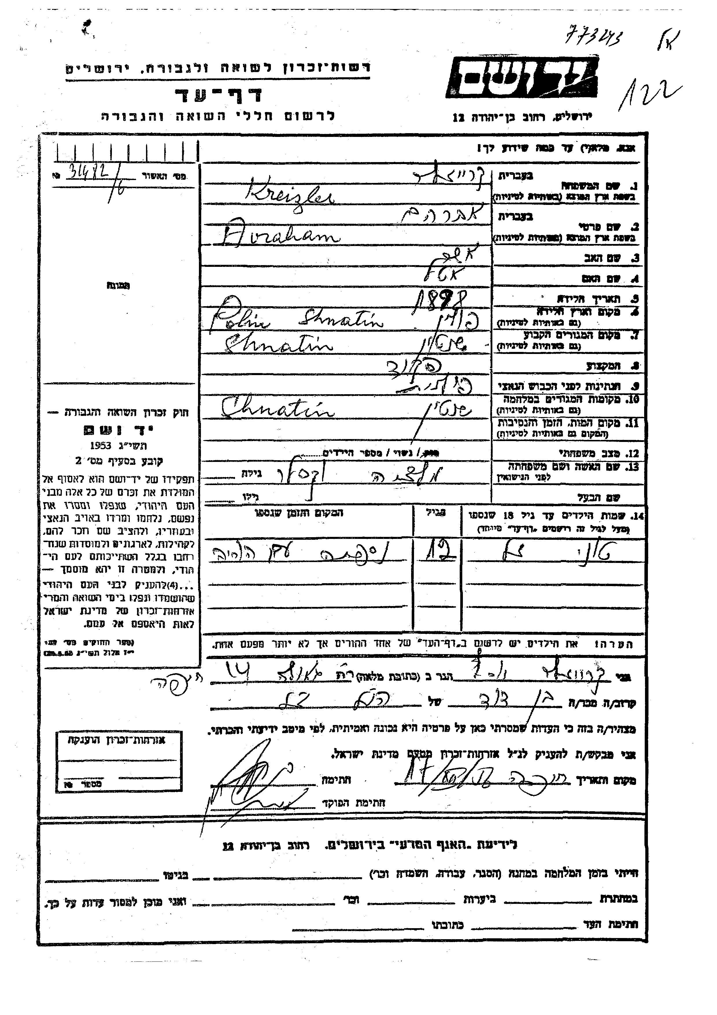 Kreizler | Avraham | 1898 | Shnatin, Pologne | Feuille de témoignage |