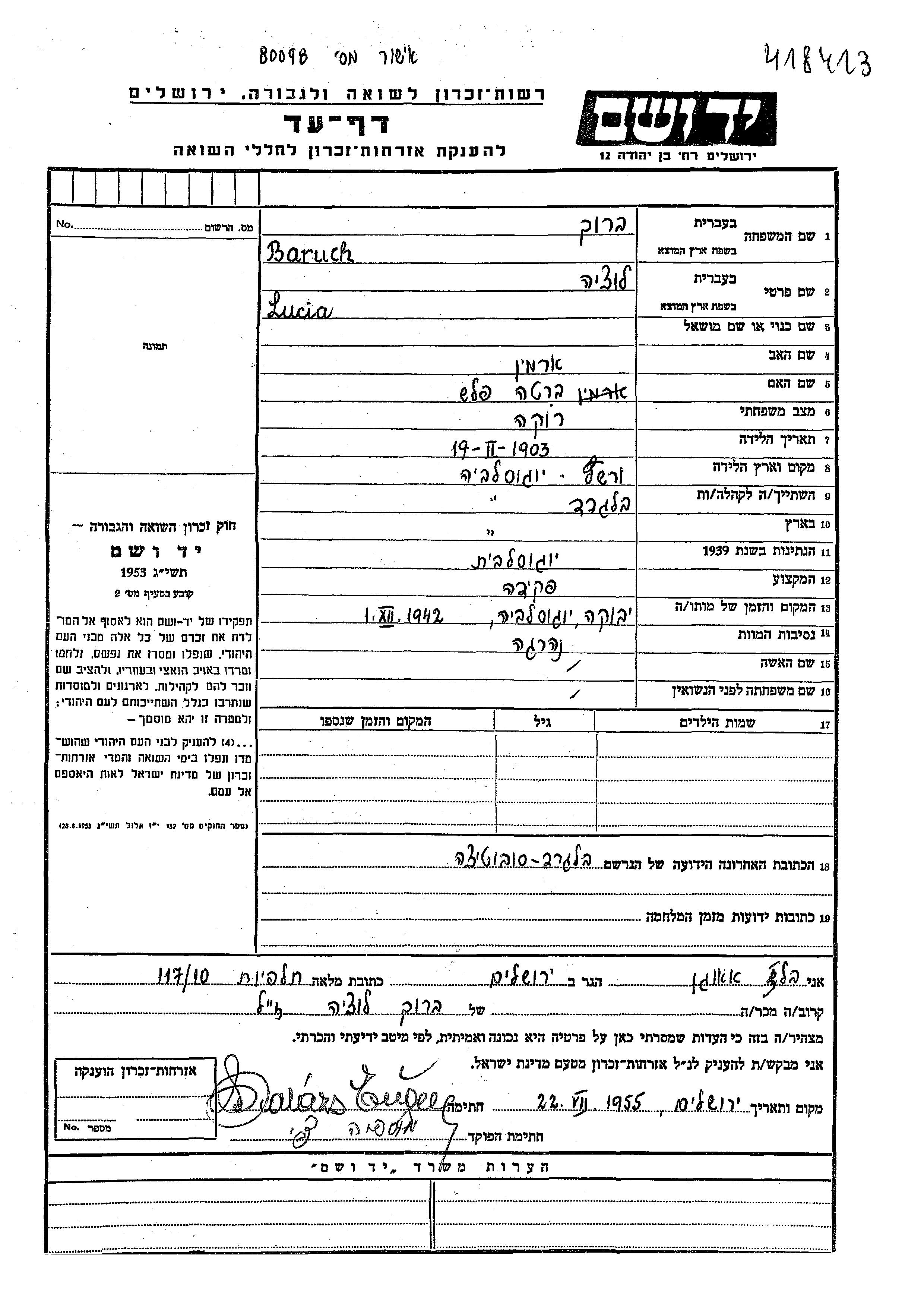 Baruch Lucia 1903 Belgrad, Yugoslavie Feuille de témoignage