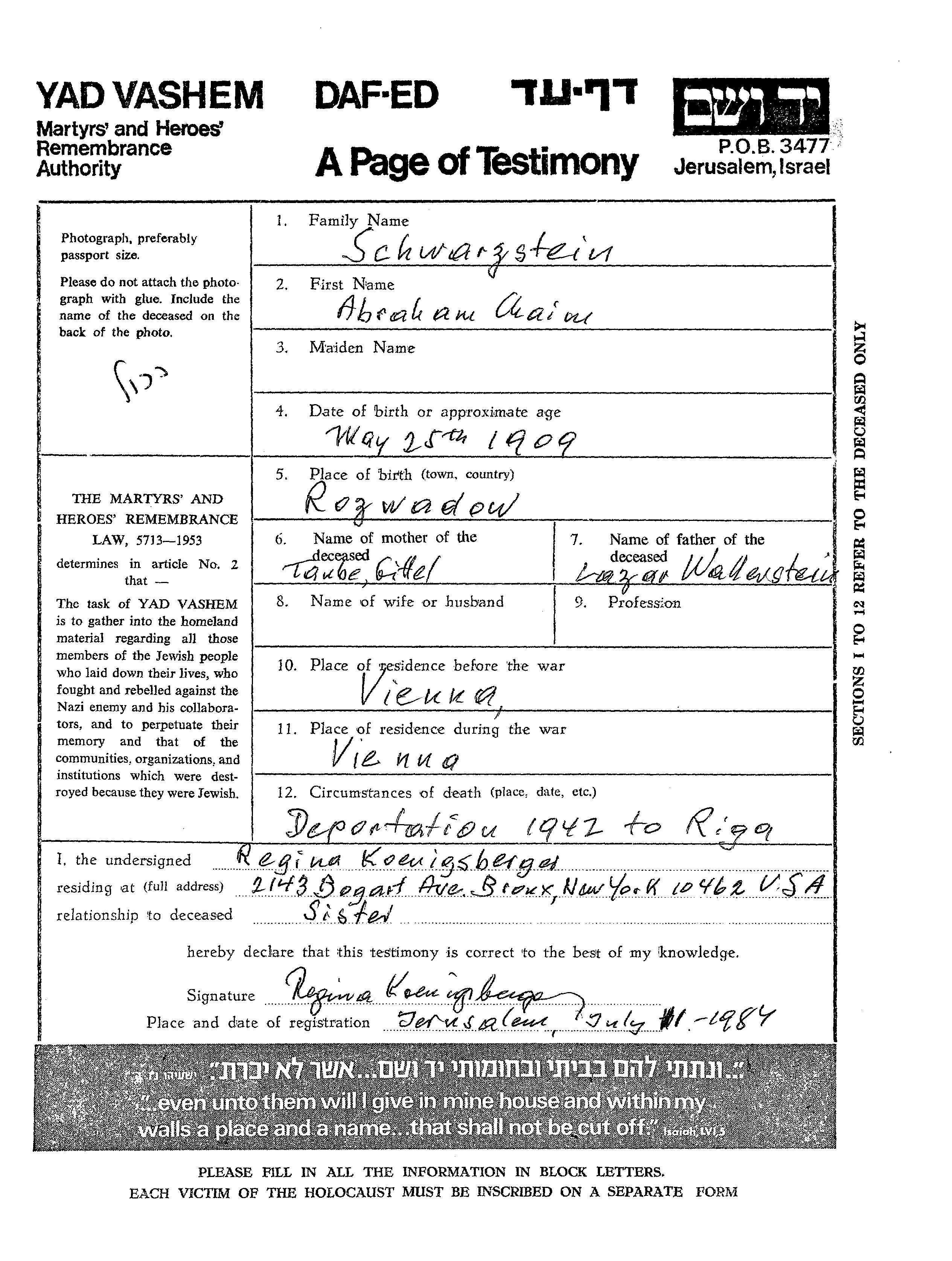 Schwarzstein Abraham Chaim 1909 Vienna, Autriche Feuille de témoignage