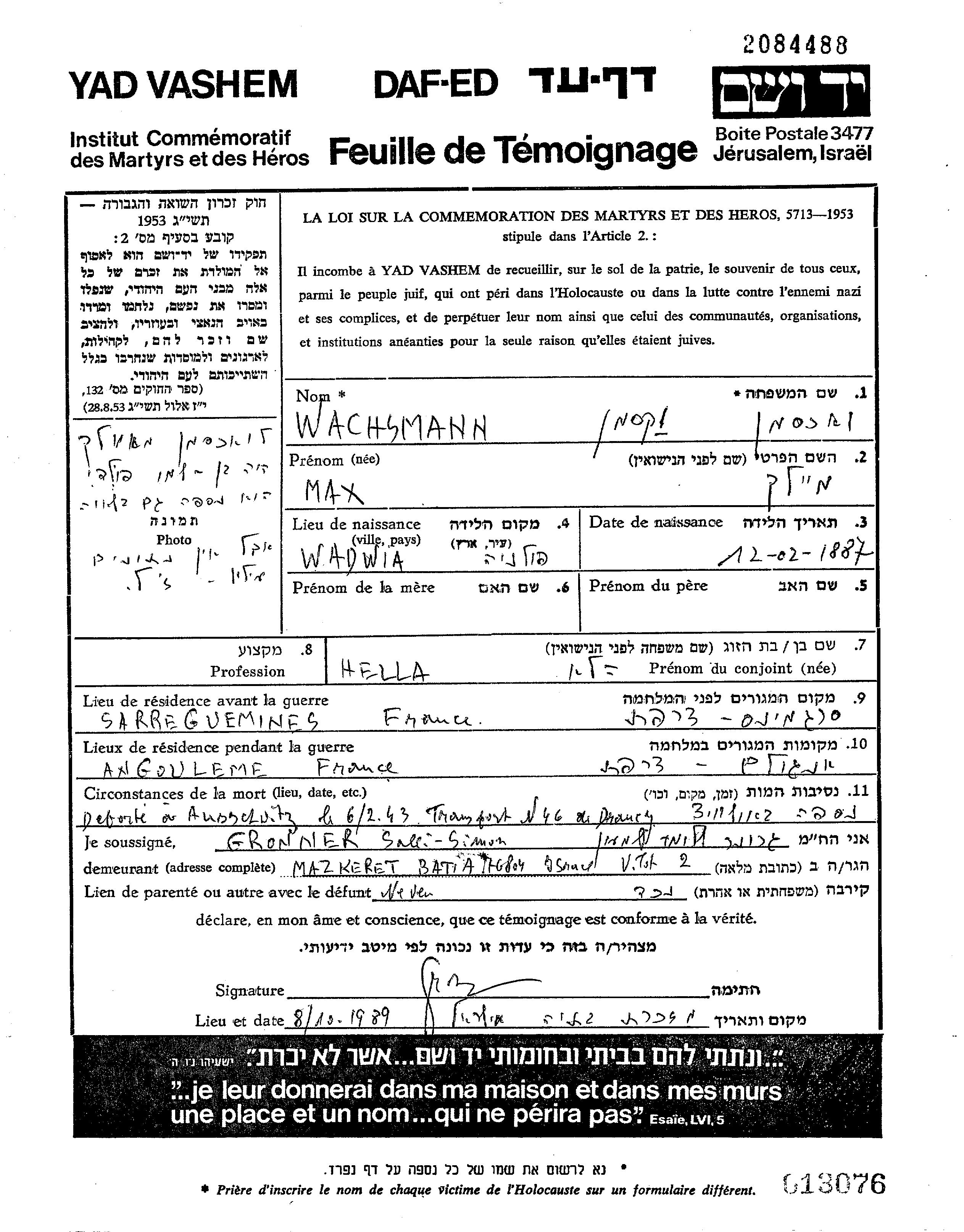 Wachsmann Meilekh Max 1887 Sarreguemines, France Feuille de témoignage