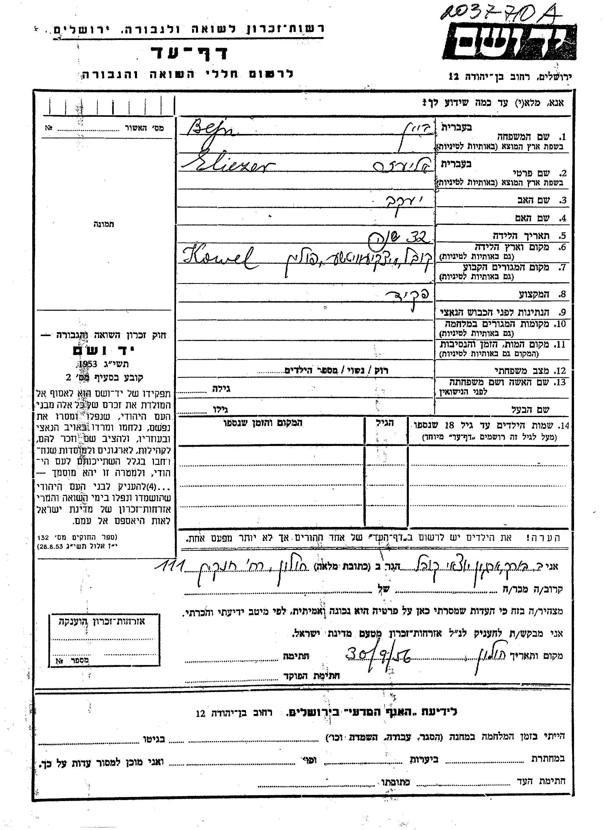 Bain | Eliezer | 1911 | Kowel, Pologne | Feuille de témoignage |