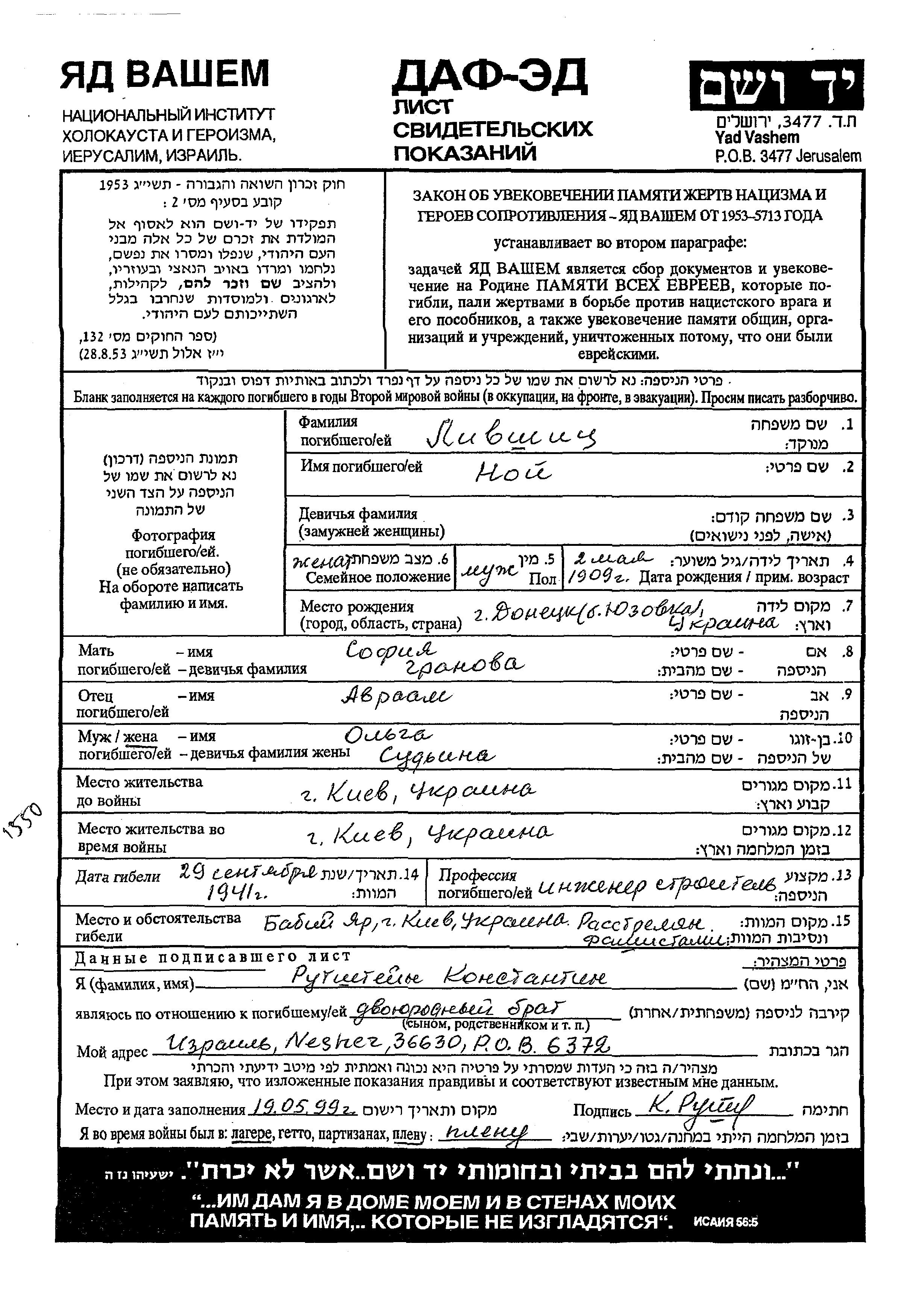 Livshitz Noi 1909 Kiev, Ukraine (URSS) Feuille de témoignage