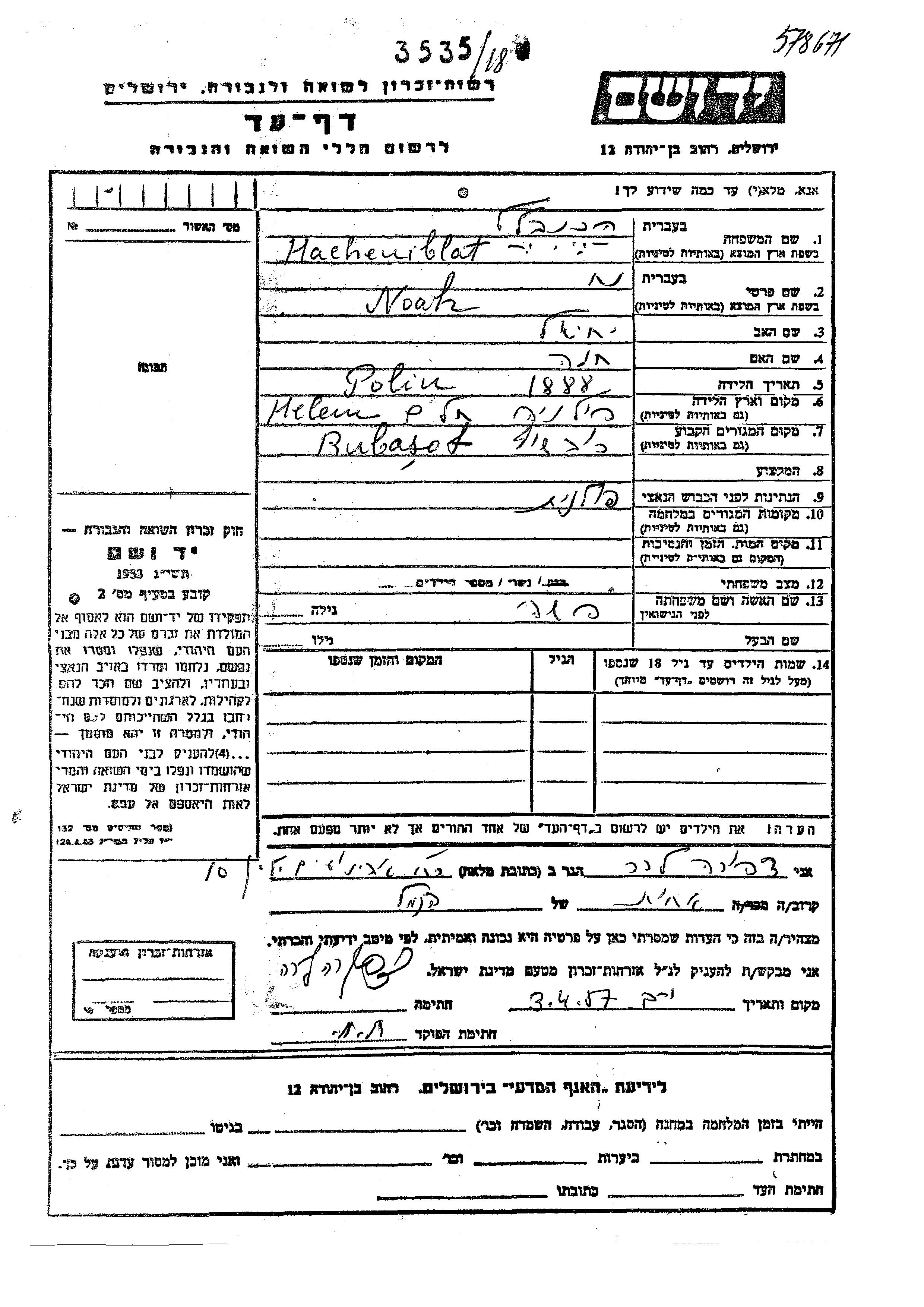 Noah Hacheniblat est né à Chelm, Pologne en 1888, fils de Yekhiel et de Khana. Il était Mariée à Pasha. Avant la seconde guerre mondiale il vivait à Rubashov, Pologne.