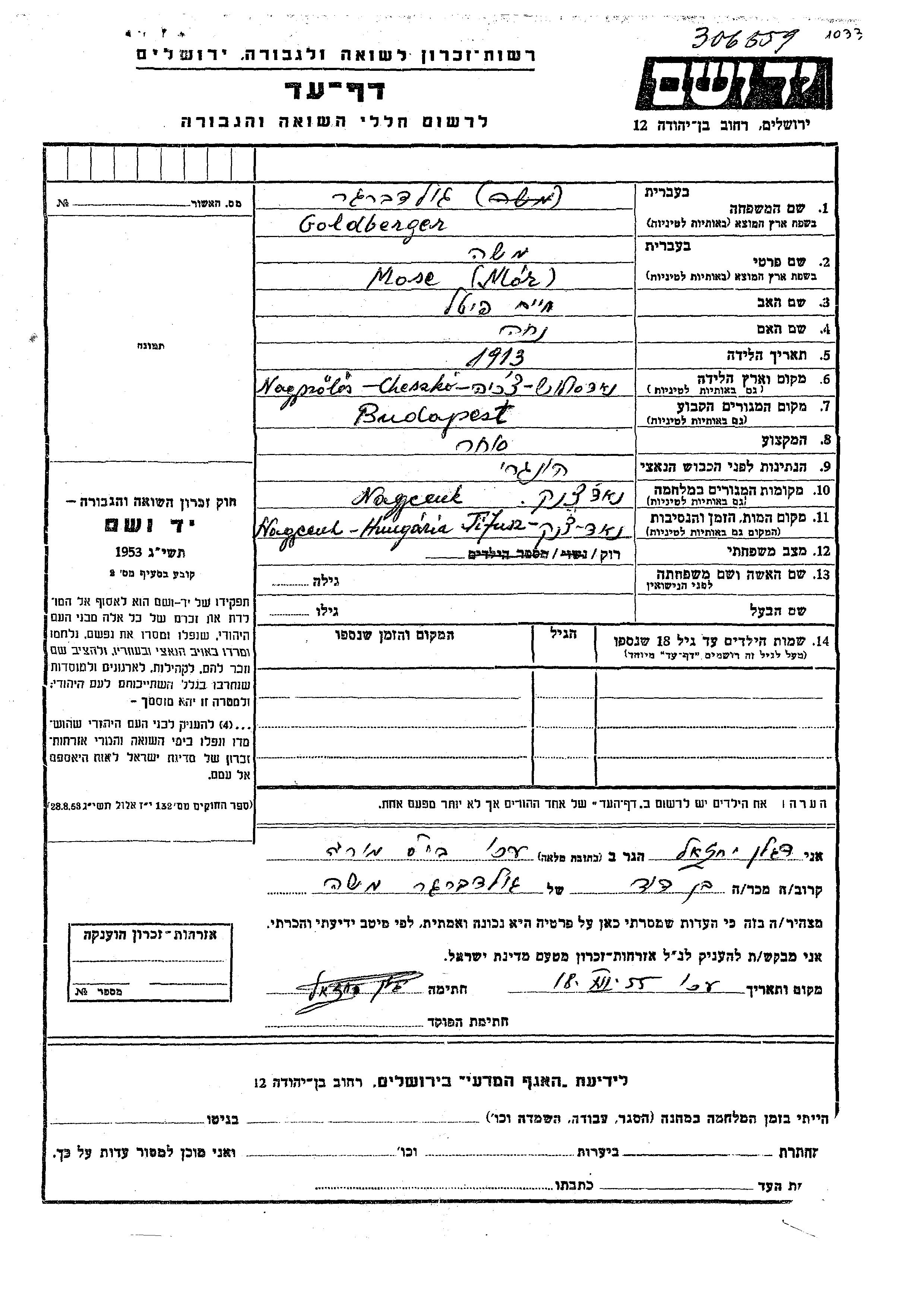 Goldberger Moshe 1913 Budapest, Hongrie Feuille de témoignage