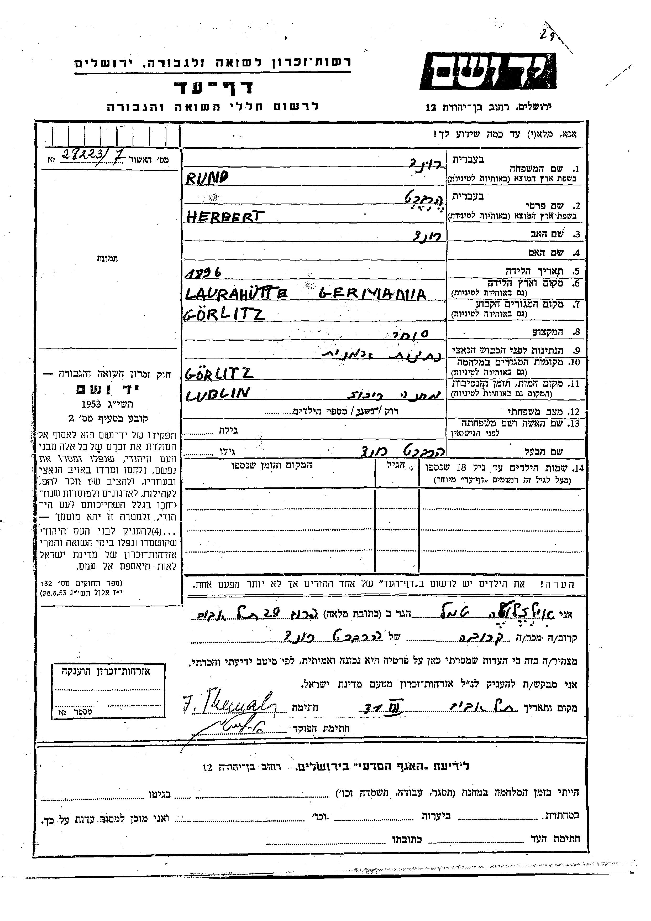 Herbert Rund est né à Laurahutte, Pologne en 1896. Il était Commerçant/e et Célibataire. Avant la seconde guerre mondiale il vivait à Gorlitza, Pologne. Au cours de la guerre, il était à Gorlitza, Pologne.
