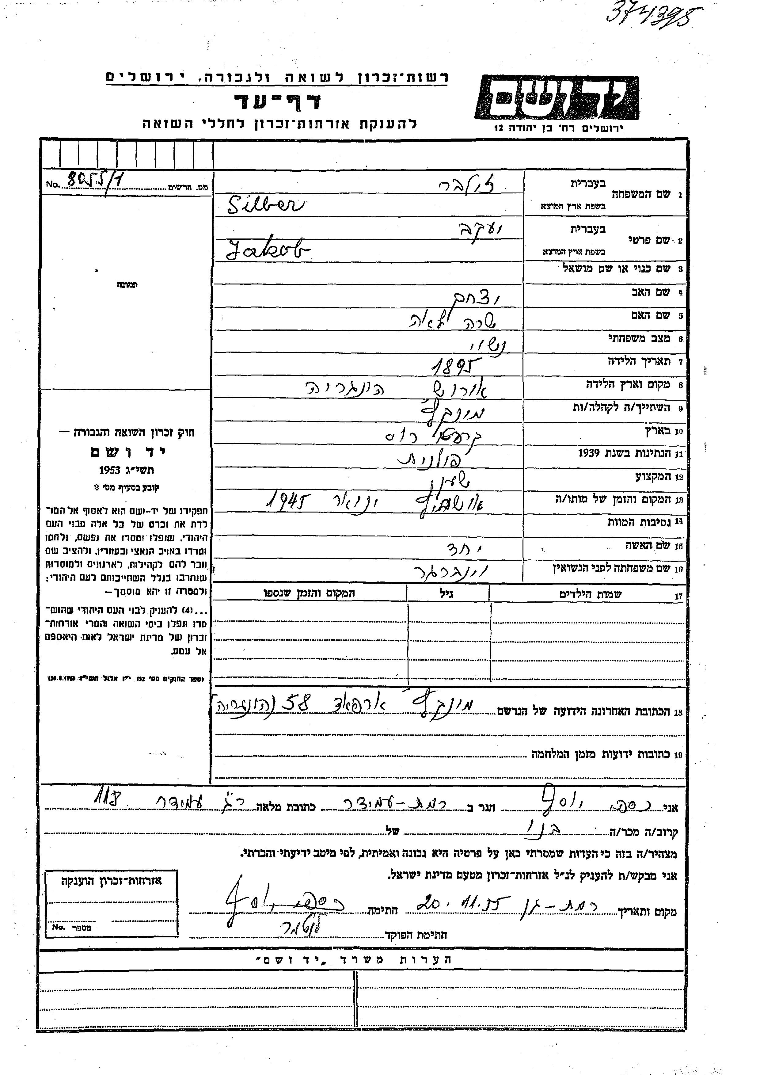 Silber Jakob 1895 Mukacevo, Tchécoslovaquie Feuille de témoignage