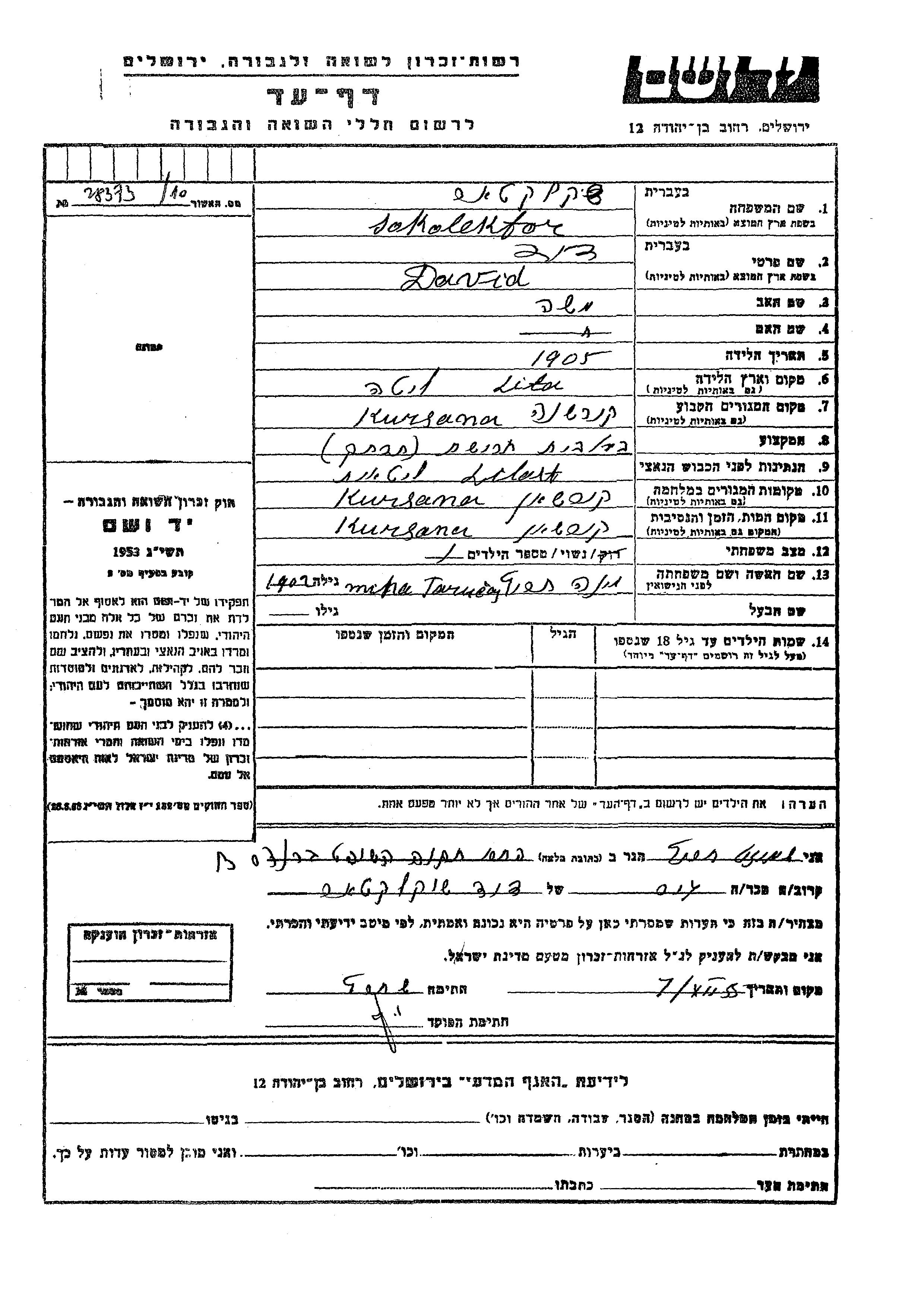 Sokolektor Dawid 1905 Kuršėnai, Lituanie Feuille de témoignage