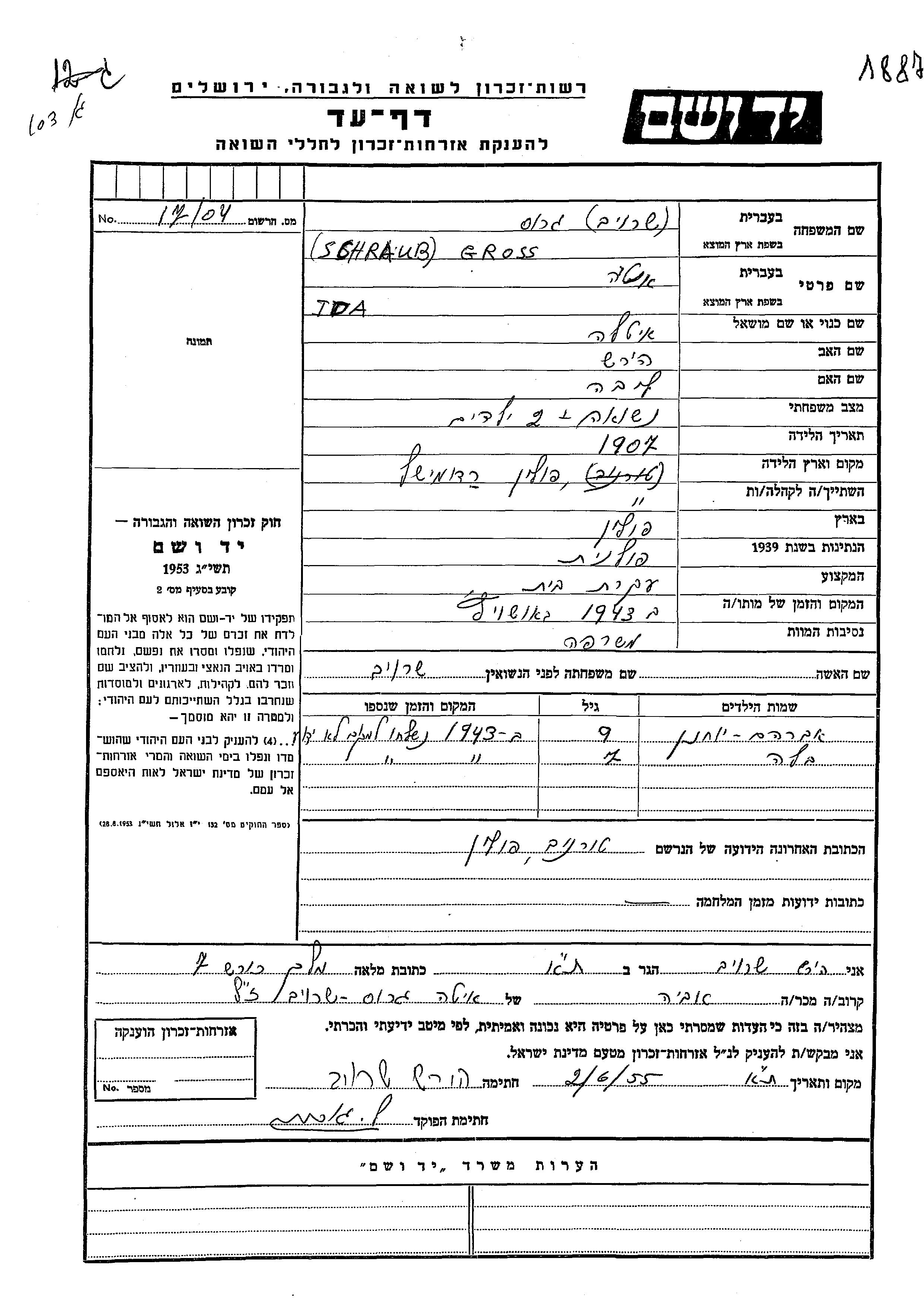 Ita Gross née Schraub est née à Radomysl Wielki, Pologne en 1907, fille de Hirsh et de Liba. Elle était Femme au foyer et Mariée. Avant la seconde guerre mondiale elle vivait à Radomysl Wielki, Pologne. Pendant la guerre, elle était à Tarnow, Pologne.