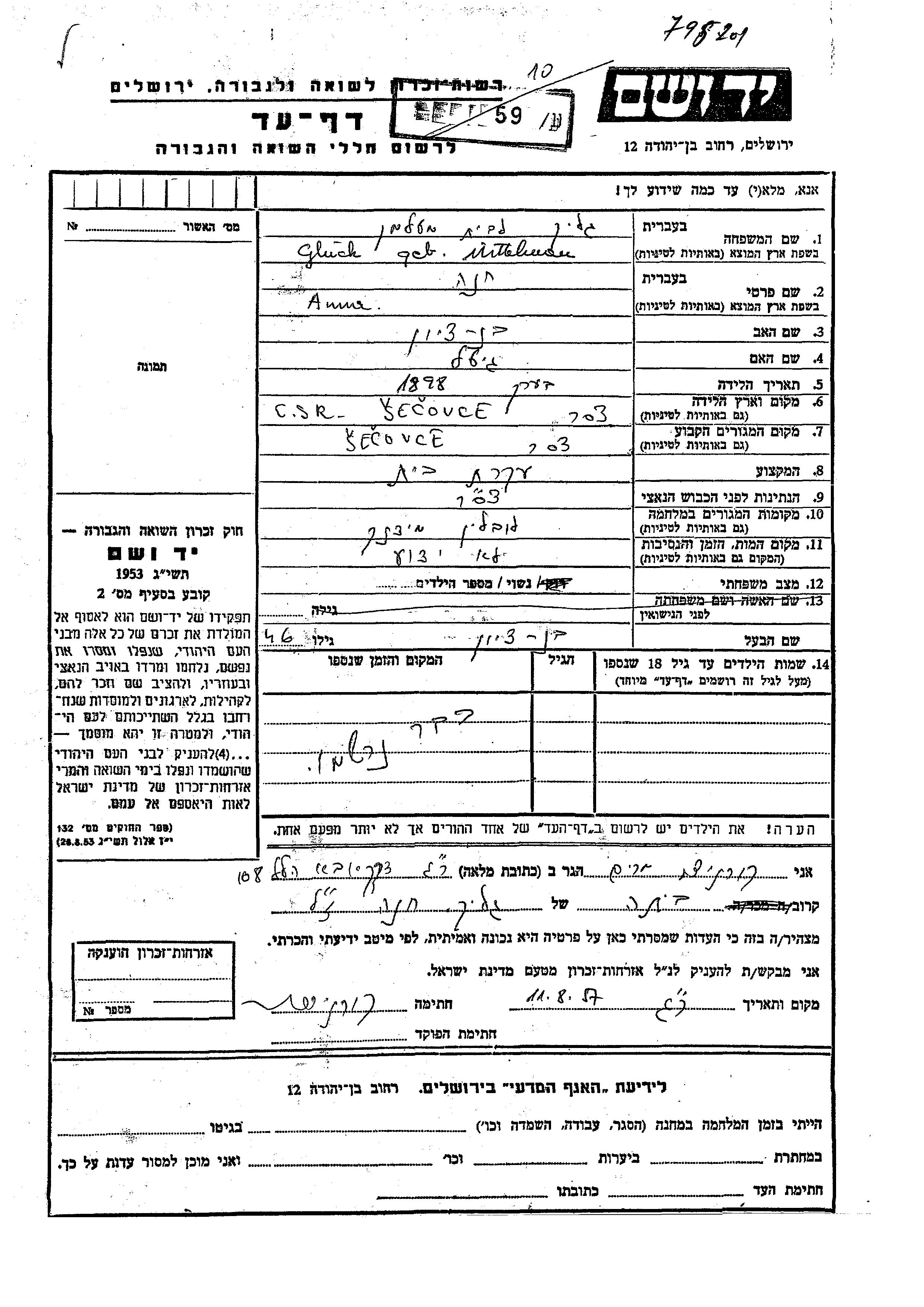 Glück Anna Chana 1898 Secovce, Tchécoslovaquie Feuille de témoignage