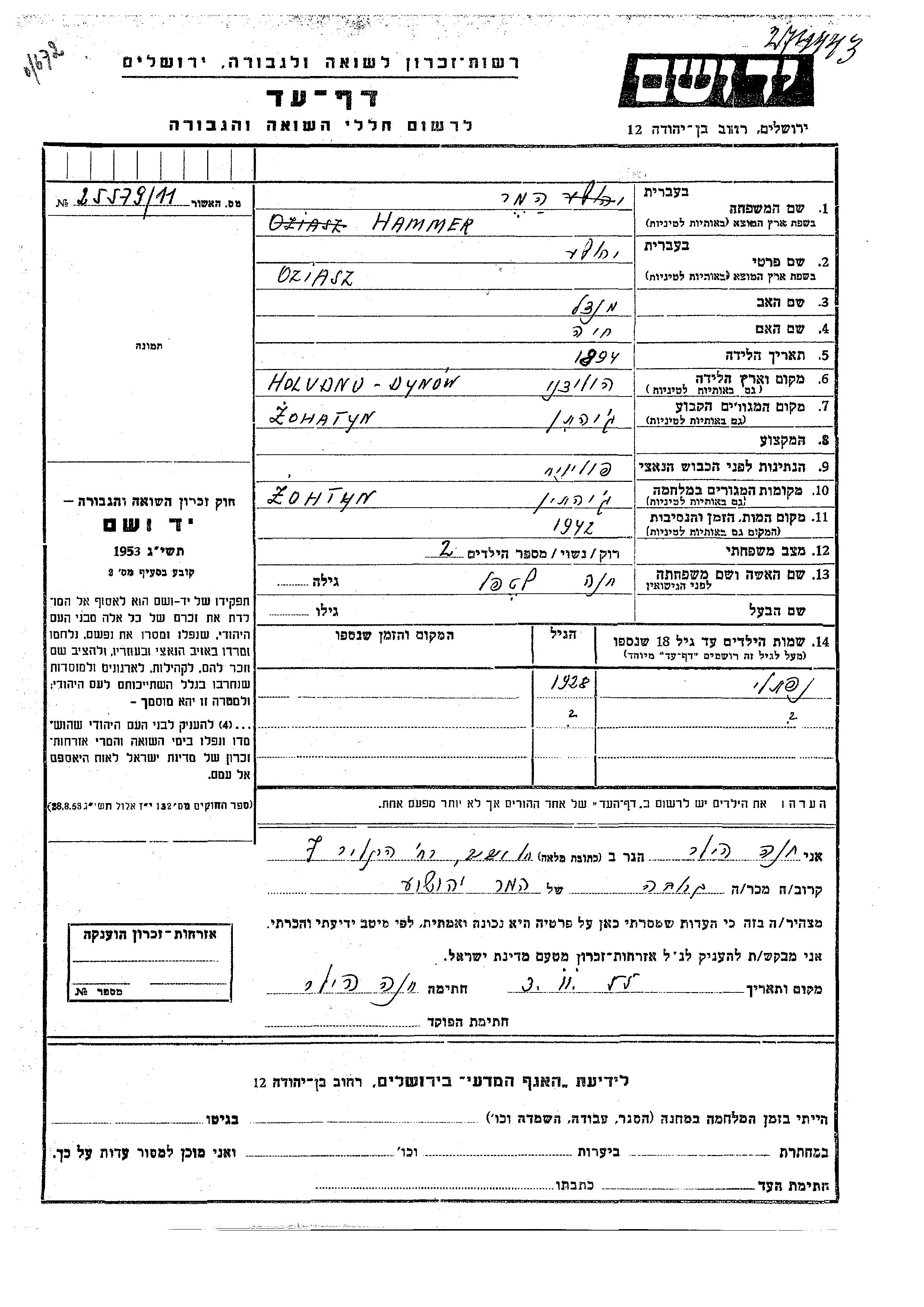 Hammer Oziasz Yehoshua 1894 Żohatyń, Pologne Feuille de témoignage
