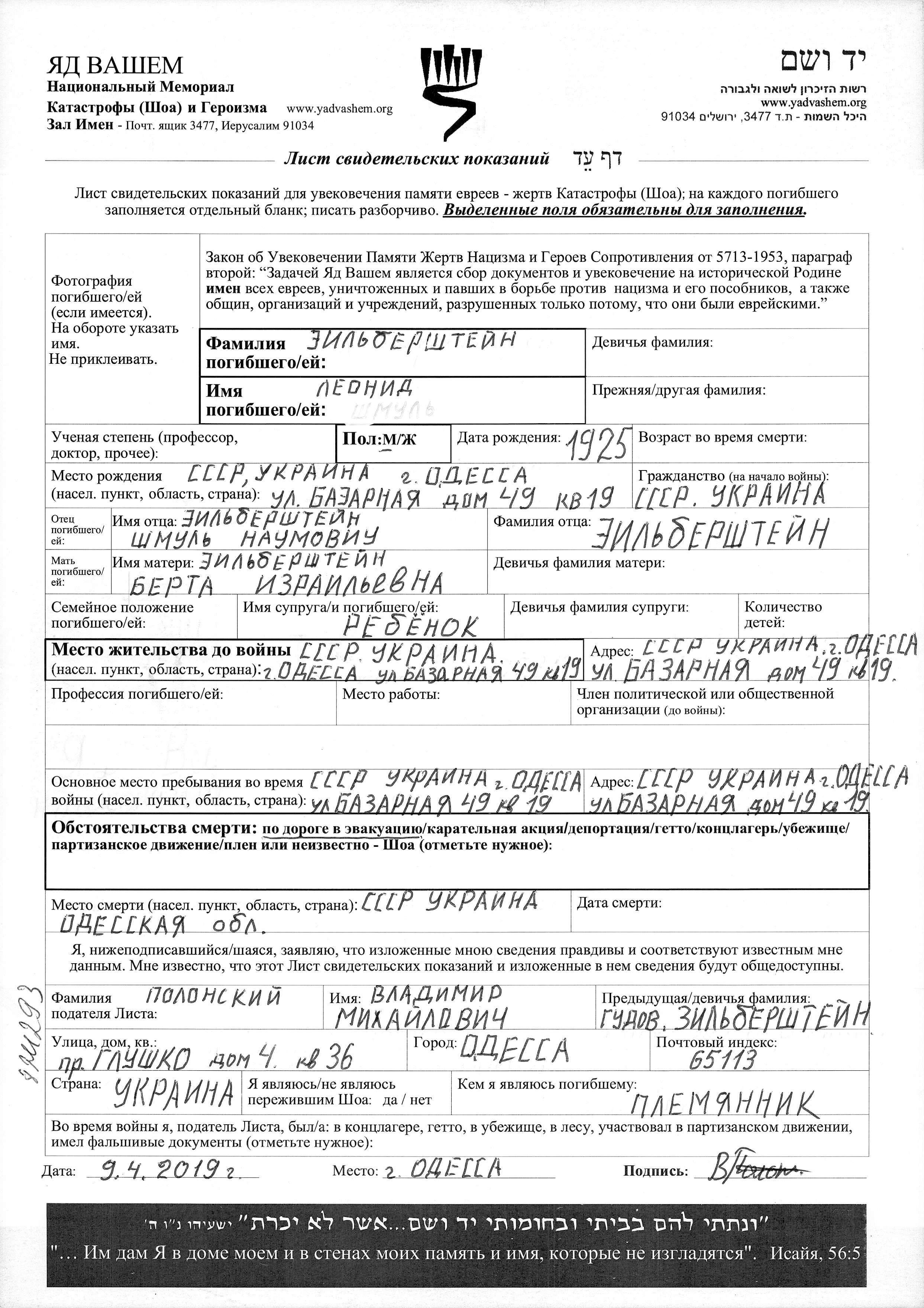 Zilbershteyn Leonid 1925 Odessa, Ukraine (URSS) Feuille de témoignage
