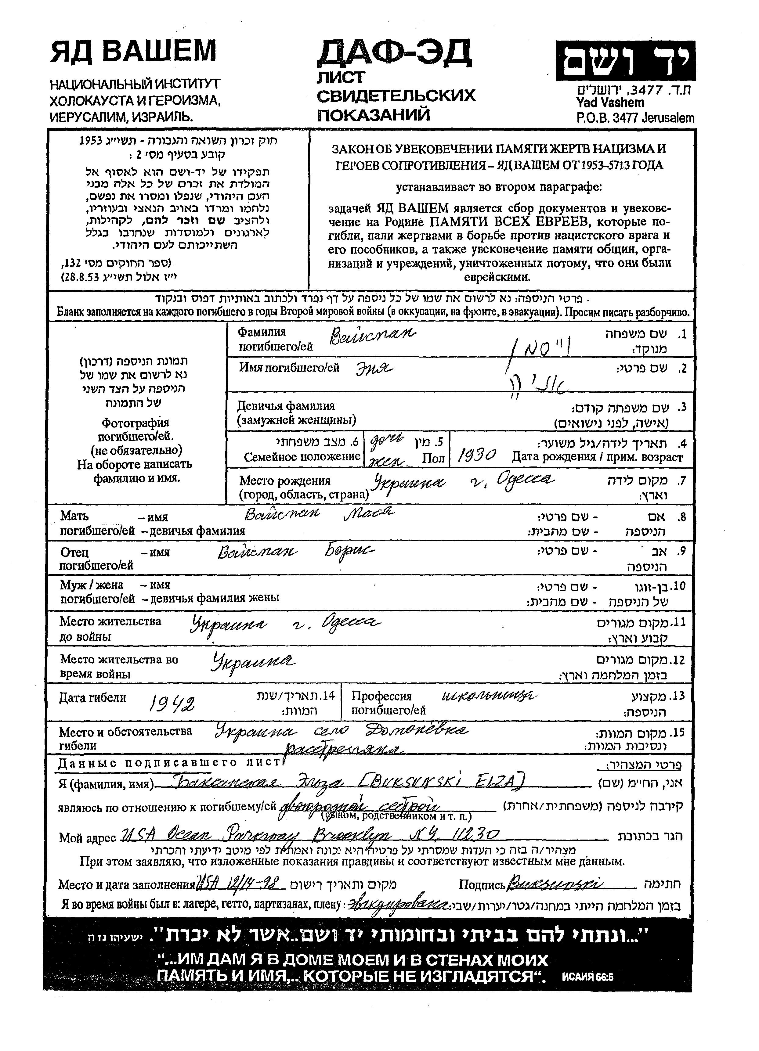 Yad Vashem - Pages of Testimony Names Memorial Collection