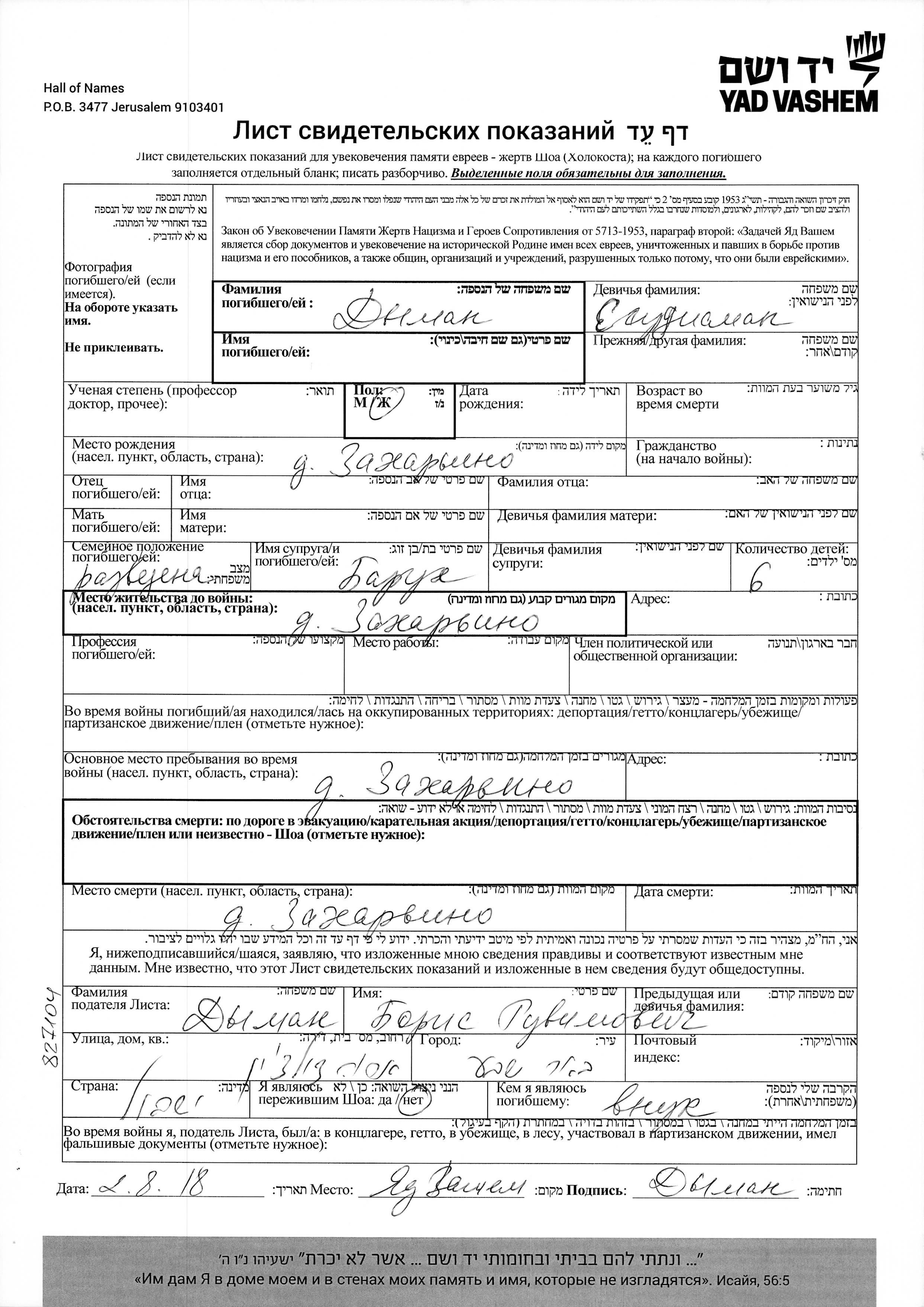 prénom inconnu Dyman née Yegudesman est née à Zakharyino, Russie (URSS). Elle était Divorcée de Barukh. Avant la seconde guerre mondiale elle vivait à Zakharyino, Russie (URSS). Pendant la guerre, elle était à Zakharyino, Russie (URSS).