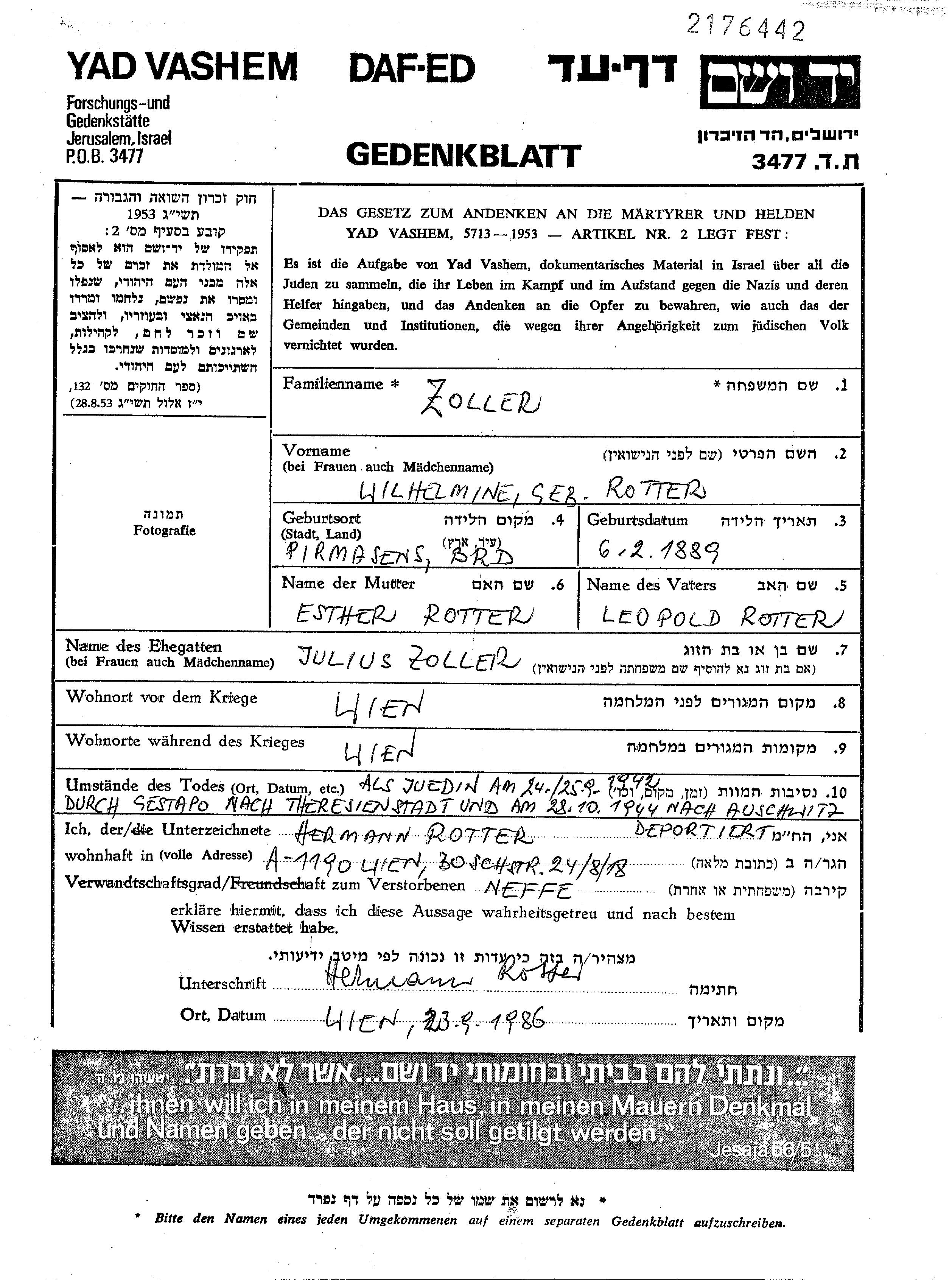 Zoller | Wilhelmine | 1889 | Wien, Autriche | Feuille de témoignage |