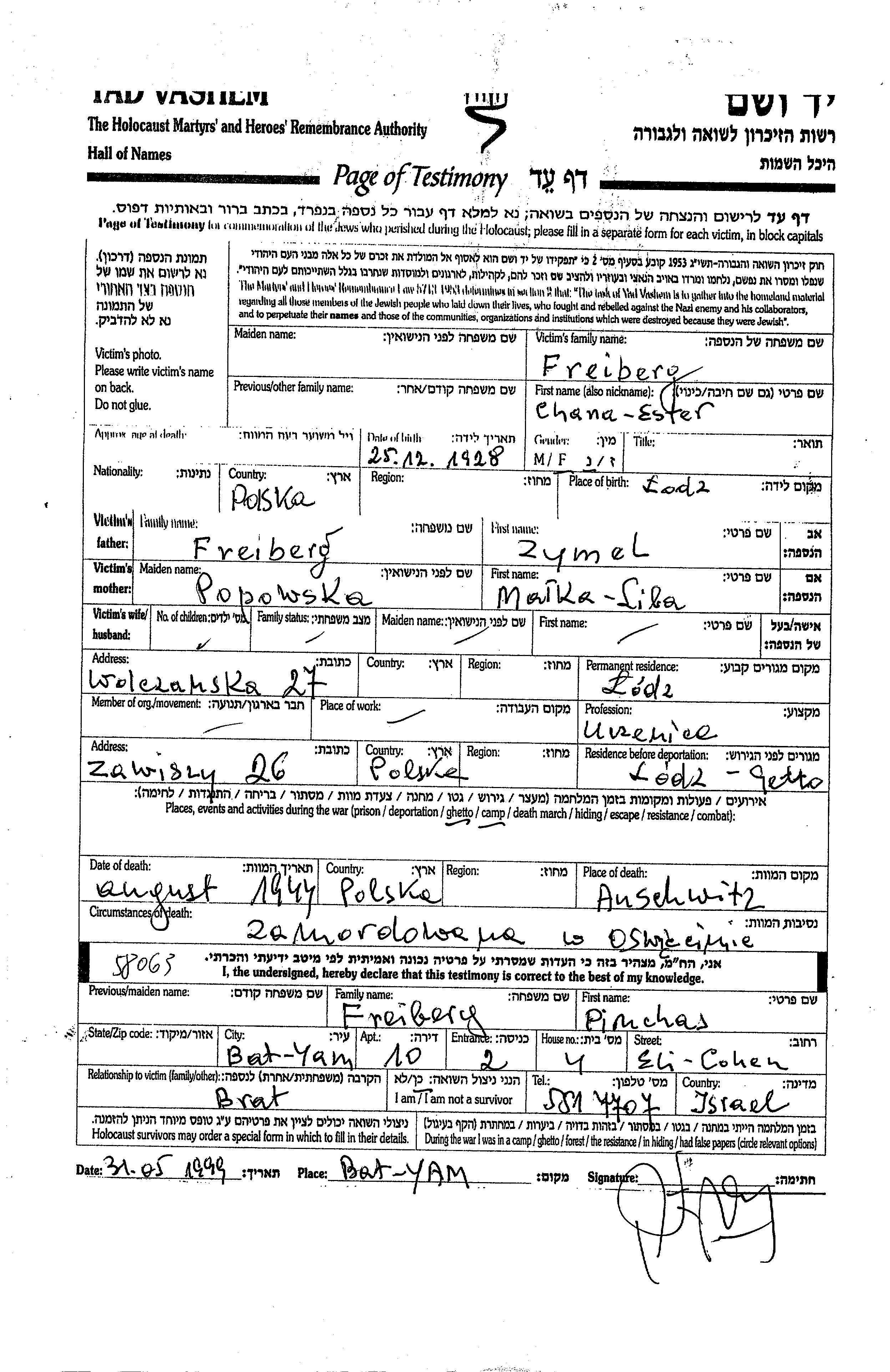 Freiberg Chana Ester 1928 Lodz, Pologne Feuille de témoignage