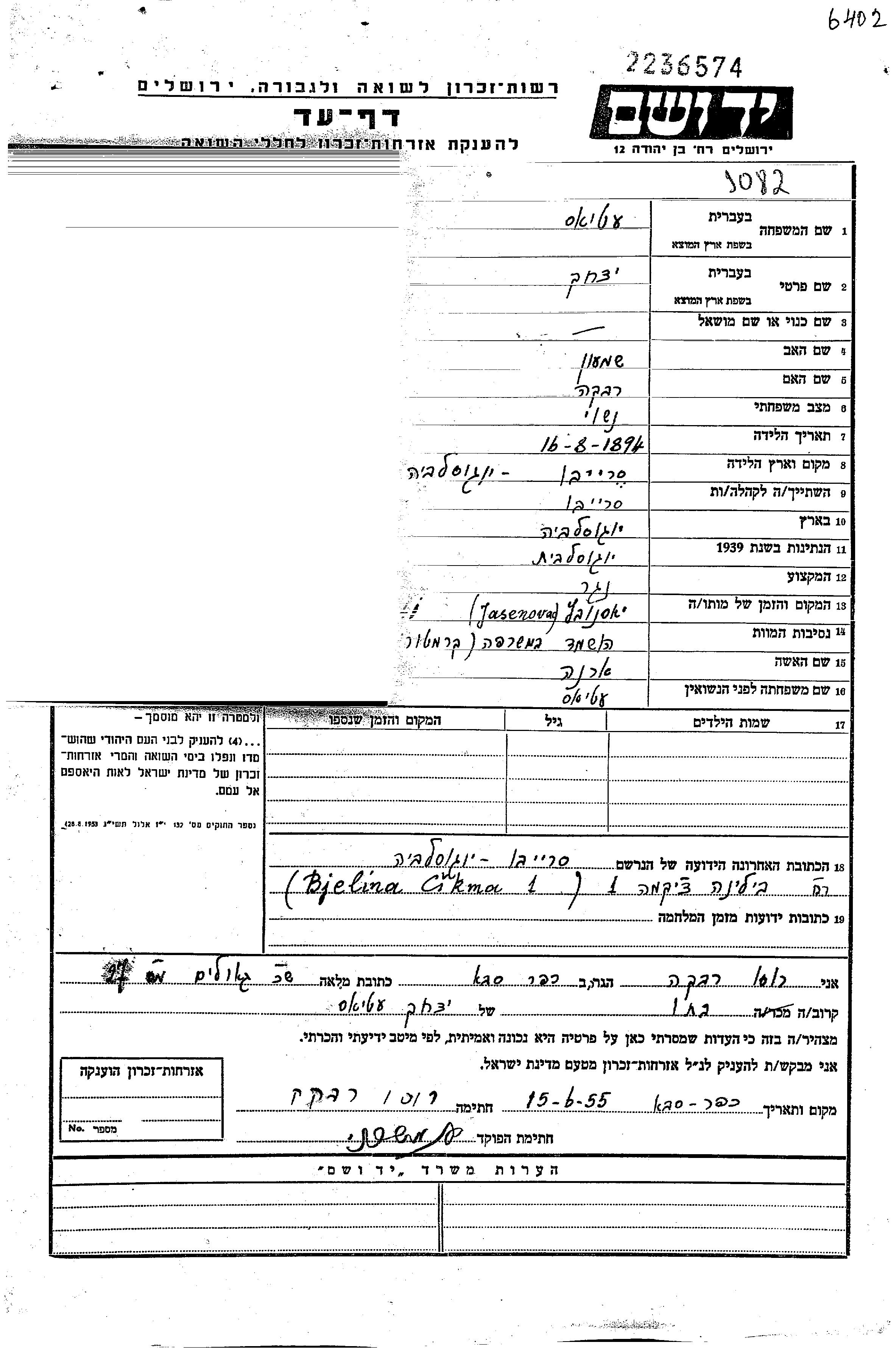 Yitzkhak a été assassiné pendant la Shoah. Lieu de la mort: Jasenovac, Yugoslavie en 1941.