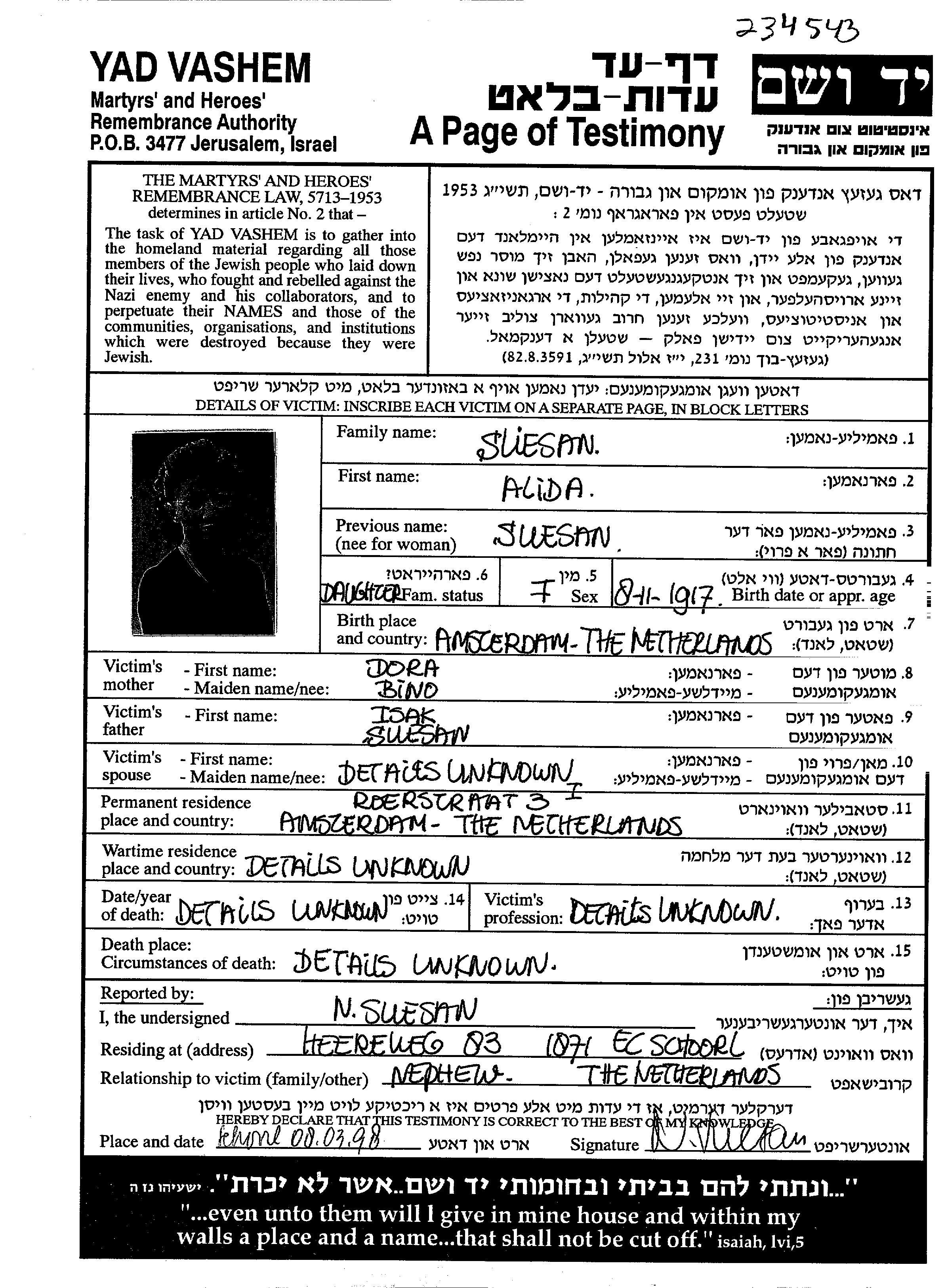 Alida Levie Suesan née Suesan est née à Amsterdam, Pays-Bas en 1917. Avant la seconde guerre mondiale elle vivait à Amsterdam, Pays-Bas.