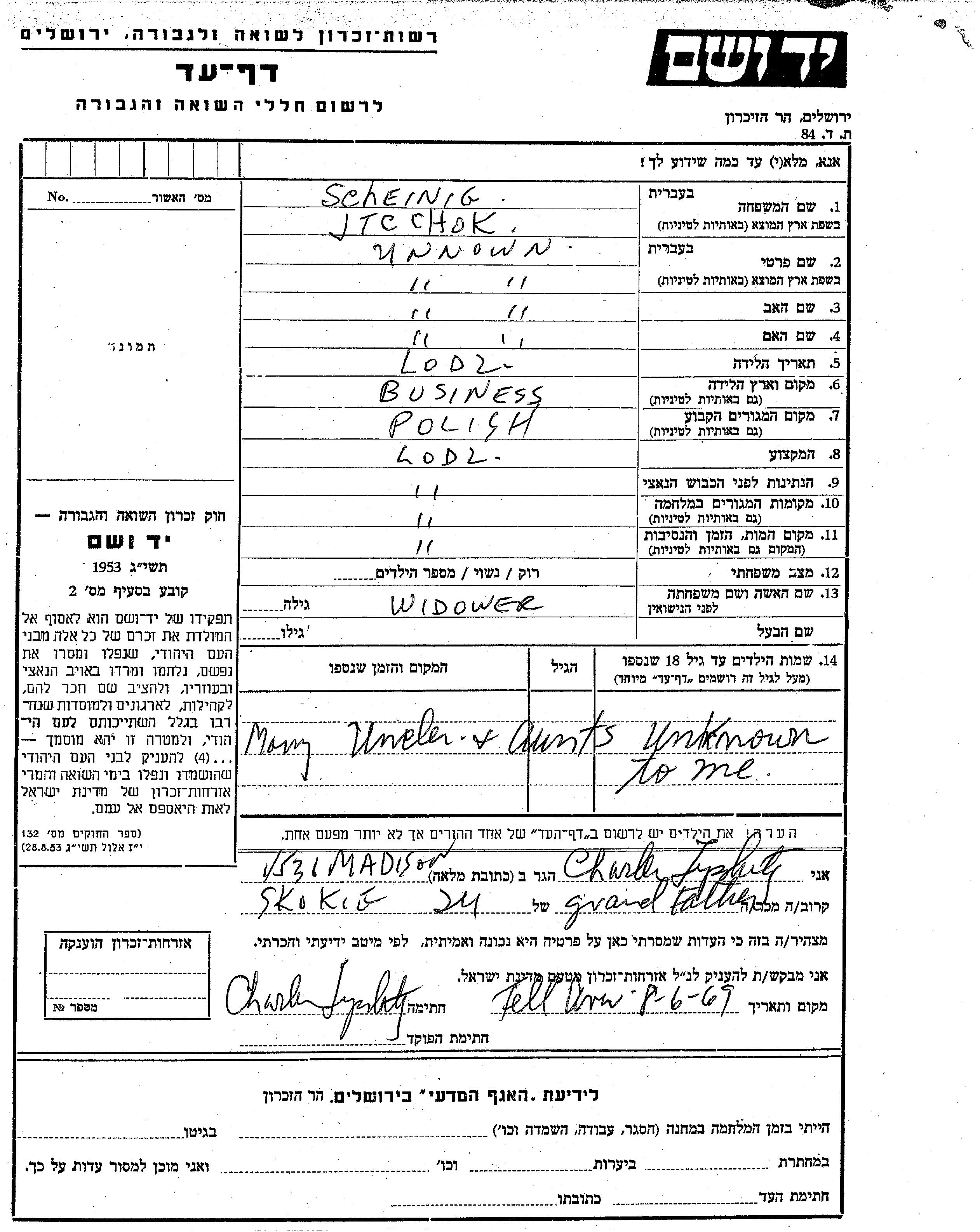 Scheinig Itcchok Lodz, Pologne Feuille de témoignage