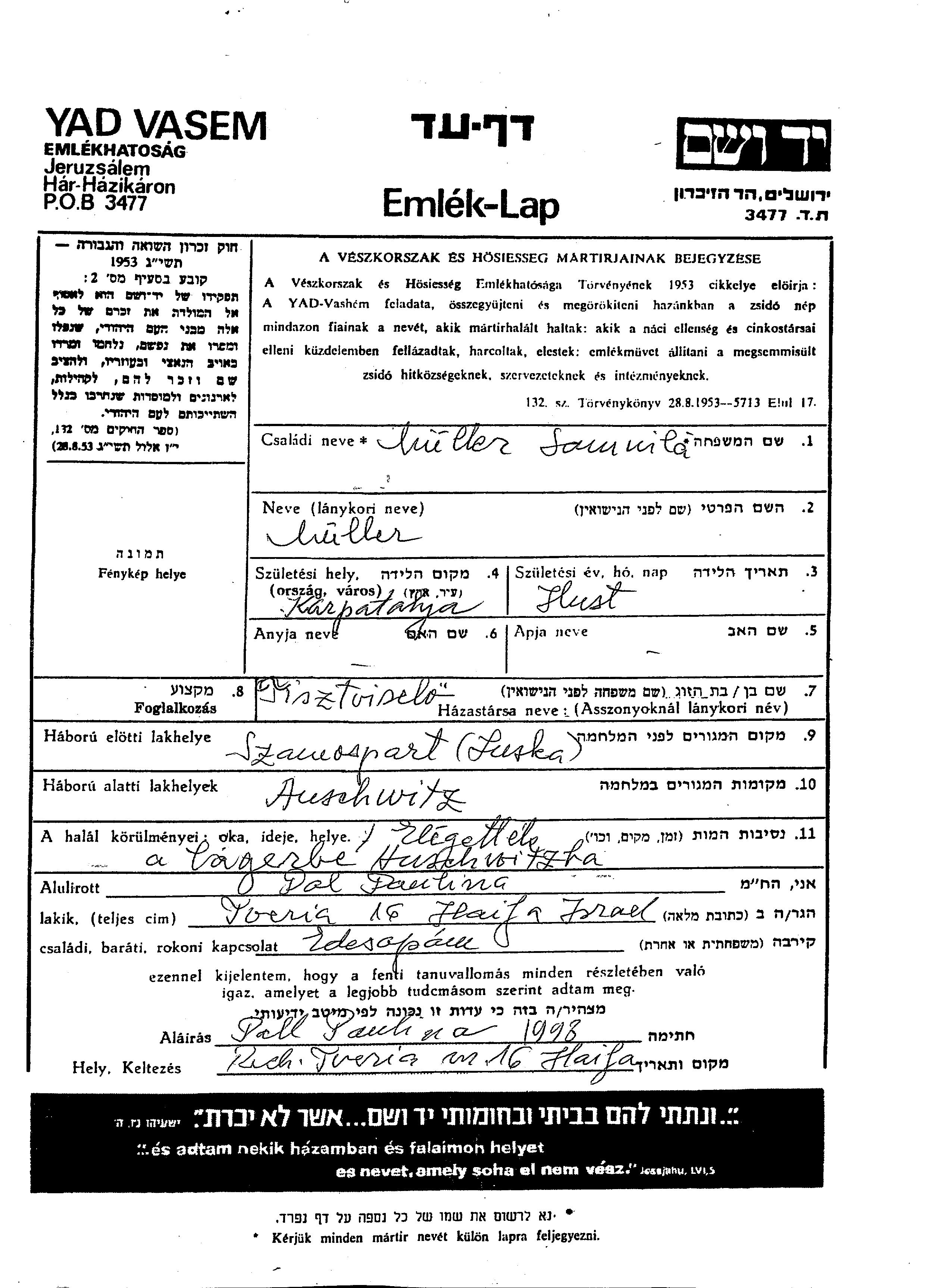 Samuila Muller est né à Carpathian Ruthenia, Tchécoslovaquie. Il était Employé/e de bureau et Marié. Avant la seconde guerre mondiale il vivait à Szamospart, Roumanie. Au cours de la guerre, il était à Auschwitz, Pologne.