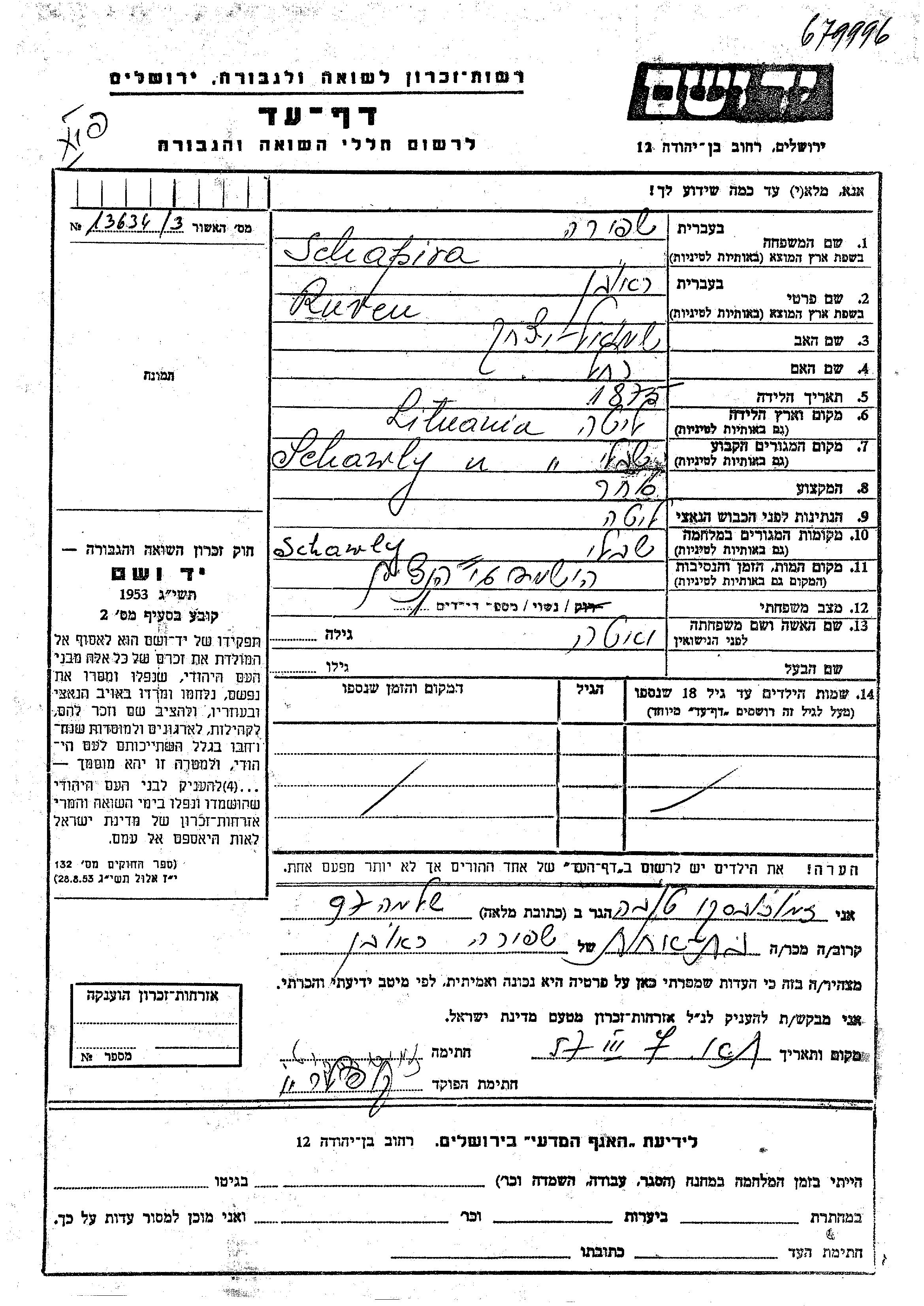 Schapira Ruven 1875 Schawl, Lituanie Feuille de témoignage