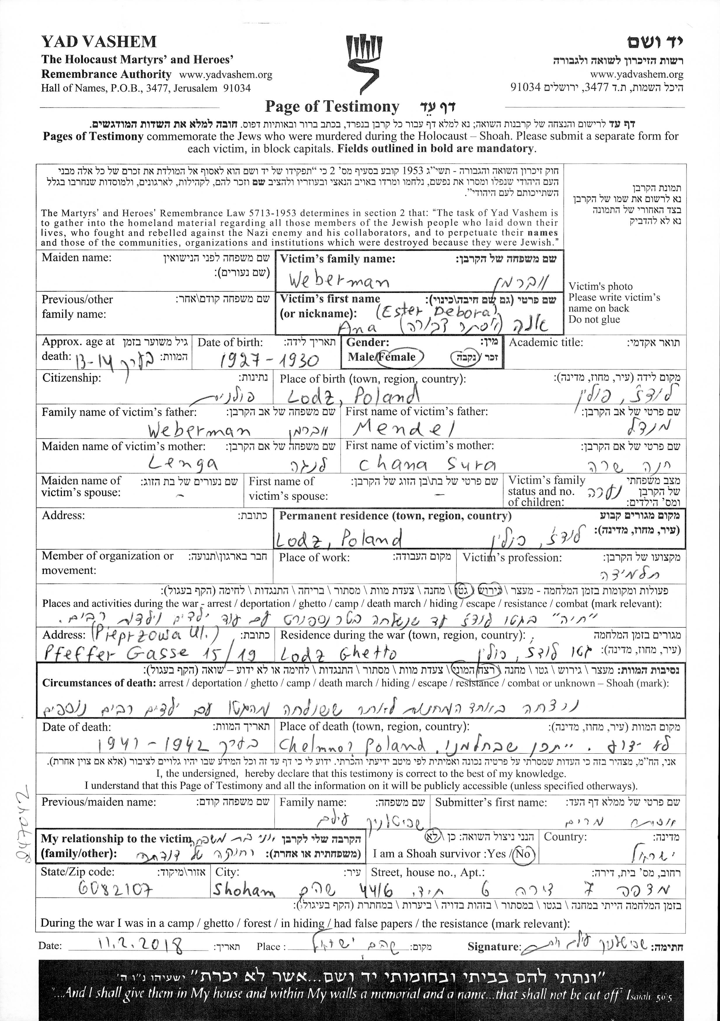Weberman Voverman Ester Debora Ana 1927 Lodz, Pologne Feuille de témoignage