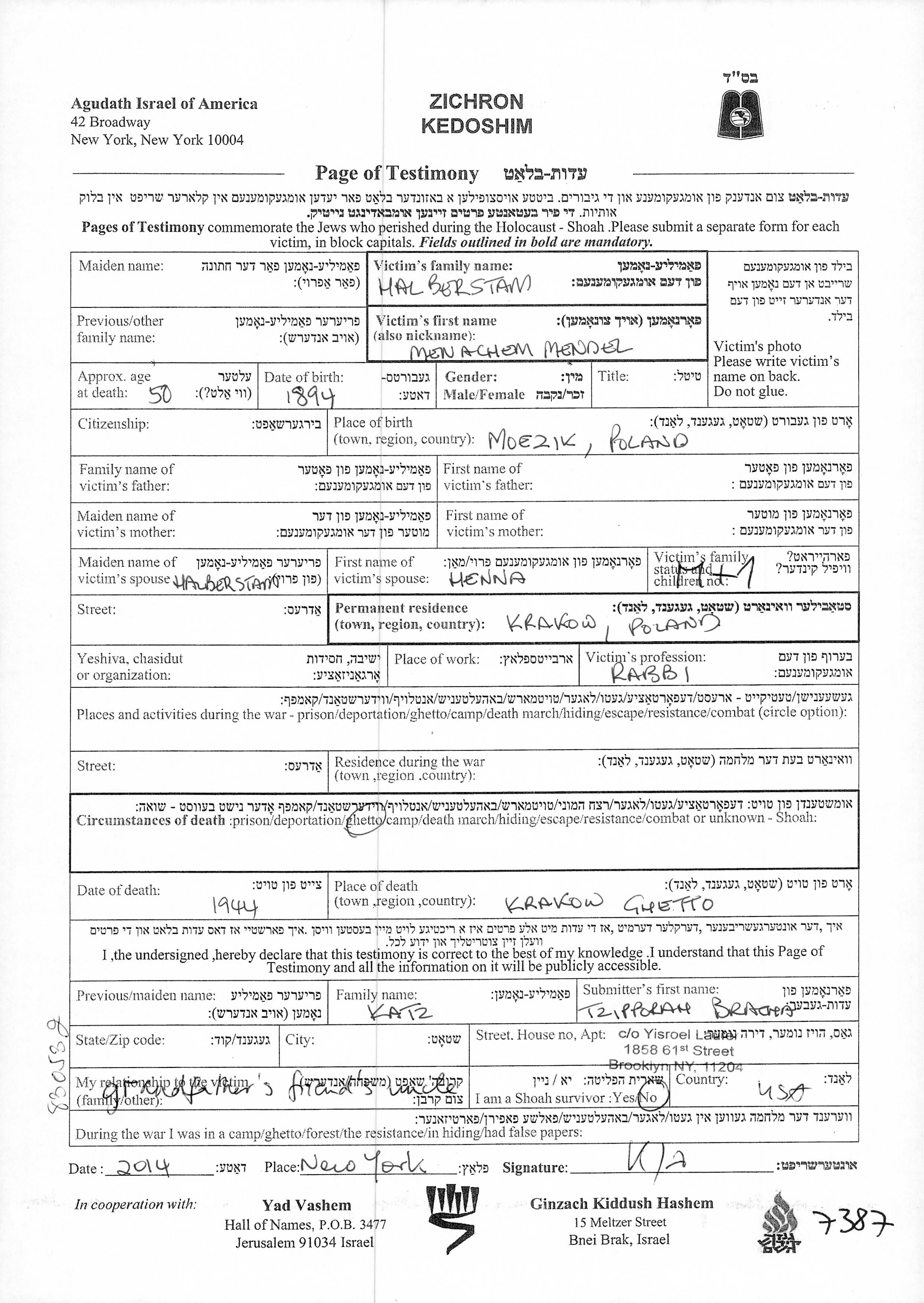 Halberstam Menachem Mendel 1894 Krakow, Pologne Feuille de témoignage