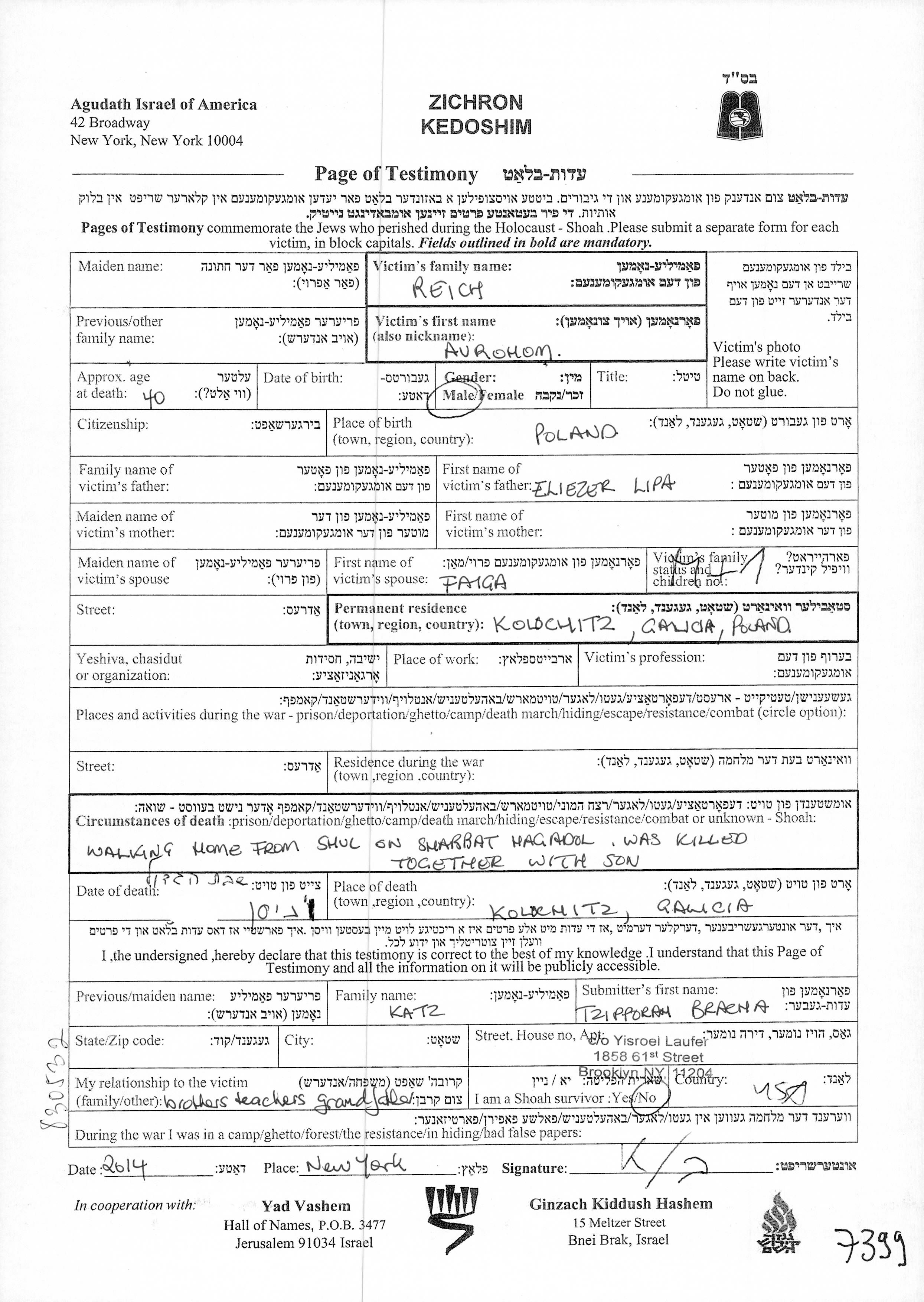 Reich Avrohom Kolochitz, Poland Feuille de témoignage