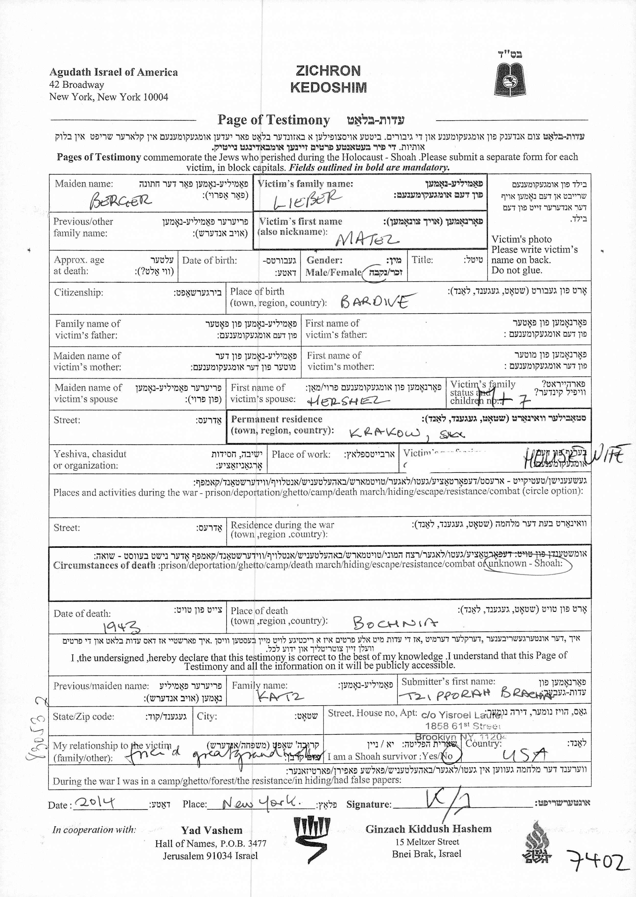 Matel Lieber née Berger est née à Bardzice, Pologne. Elle était Femme au foyer et Mariée à Hershel. Avant la seconde guerre mondiale elle vivait à Krakow, Pologne.