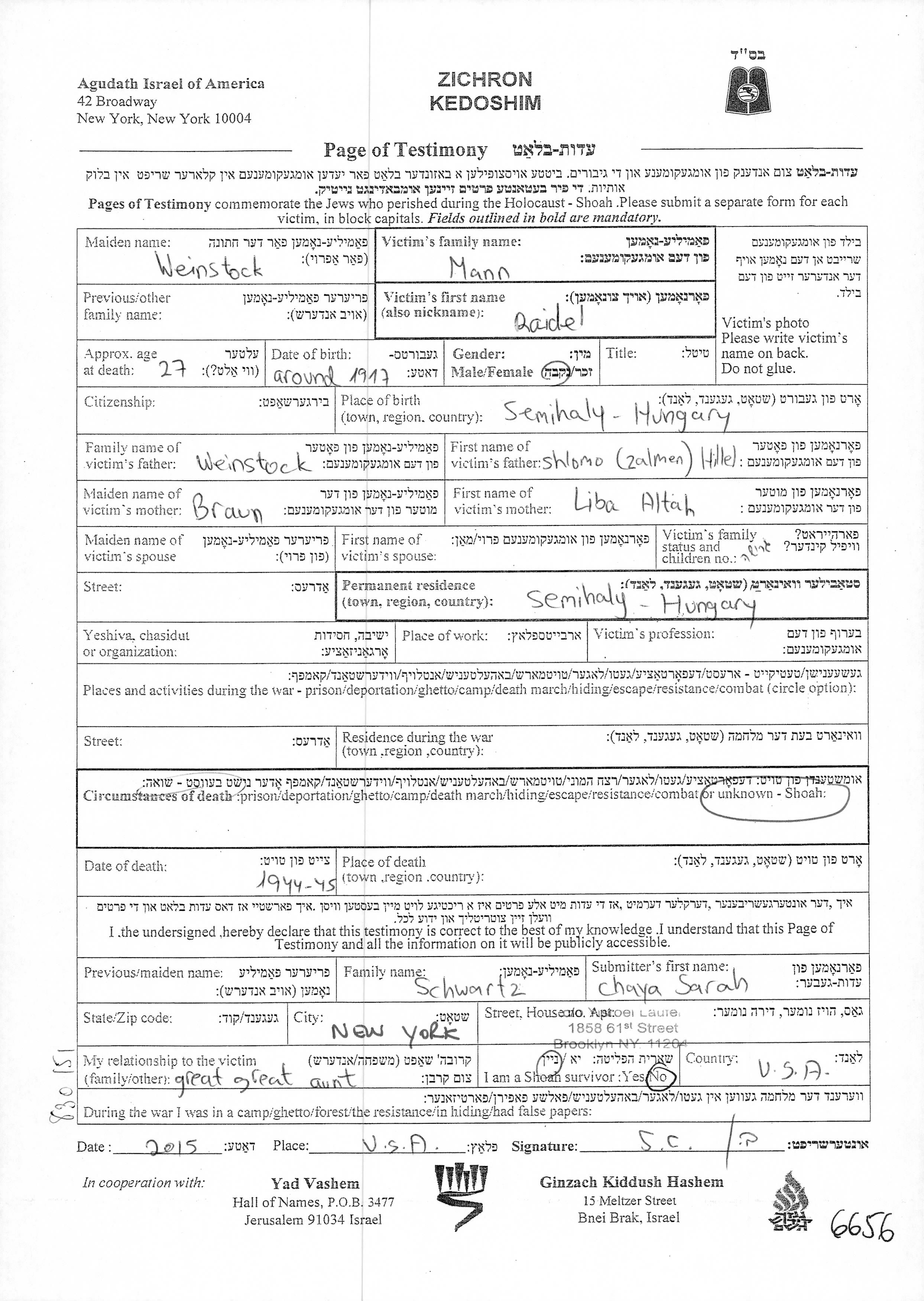Raidel Mann née Weinstock est née à Szentmihaly, Hongrie en 1917, fille de Shlomo Zalmen Hillel et de Liba Altah née Braun. Elle était Divorcée. Avant la seconde guerre mondiale elle vivait à Szentmihaly, Hongrie.
