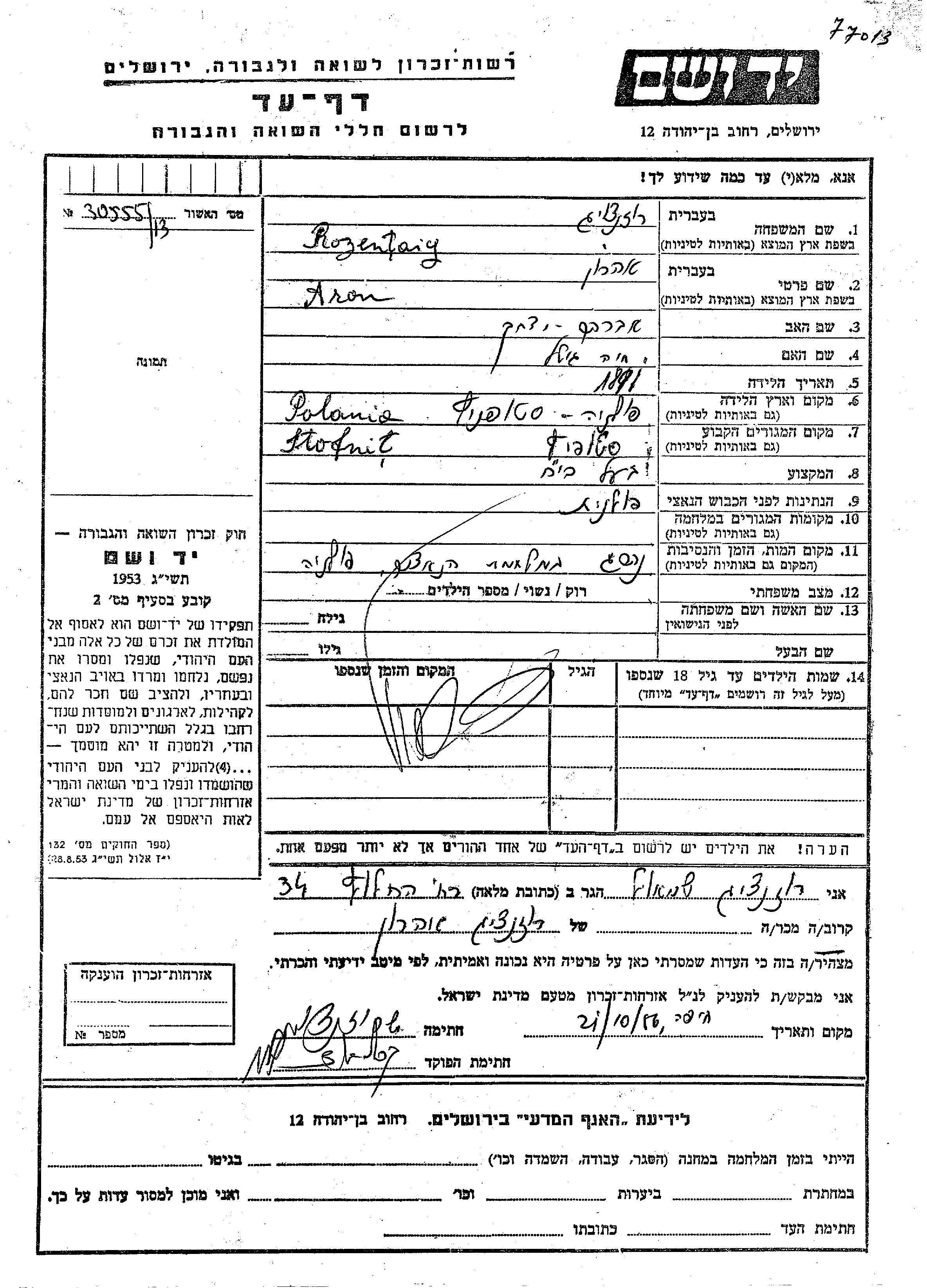 Rozentaig Aron 1891 endroit inconnu, Feuille de témoignage