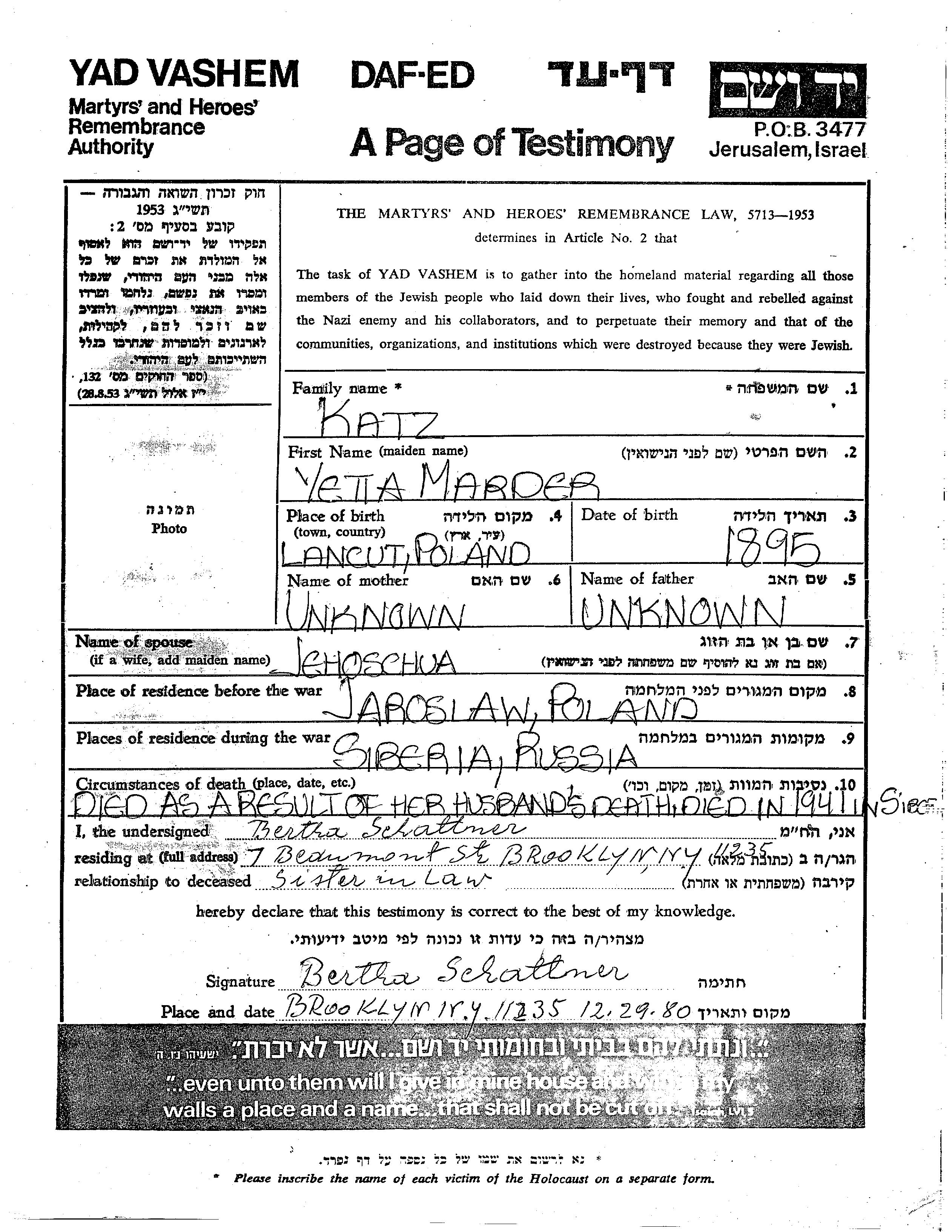 Yetta Katz née Marder est née à Lancut, Pologne en 1895. Avant la seconde guerre mondiale elle vivait à Jaroslaw, Pologne. Pendant la guerre, elle était à Siberia Region, Russie (URSS).
