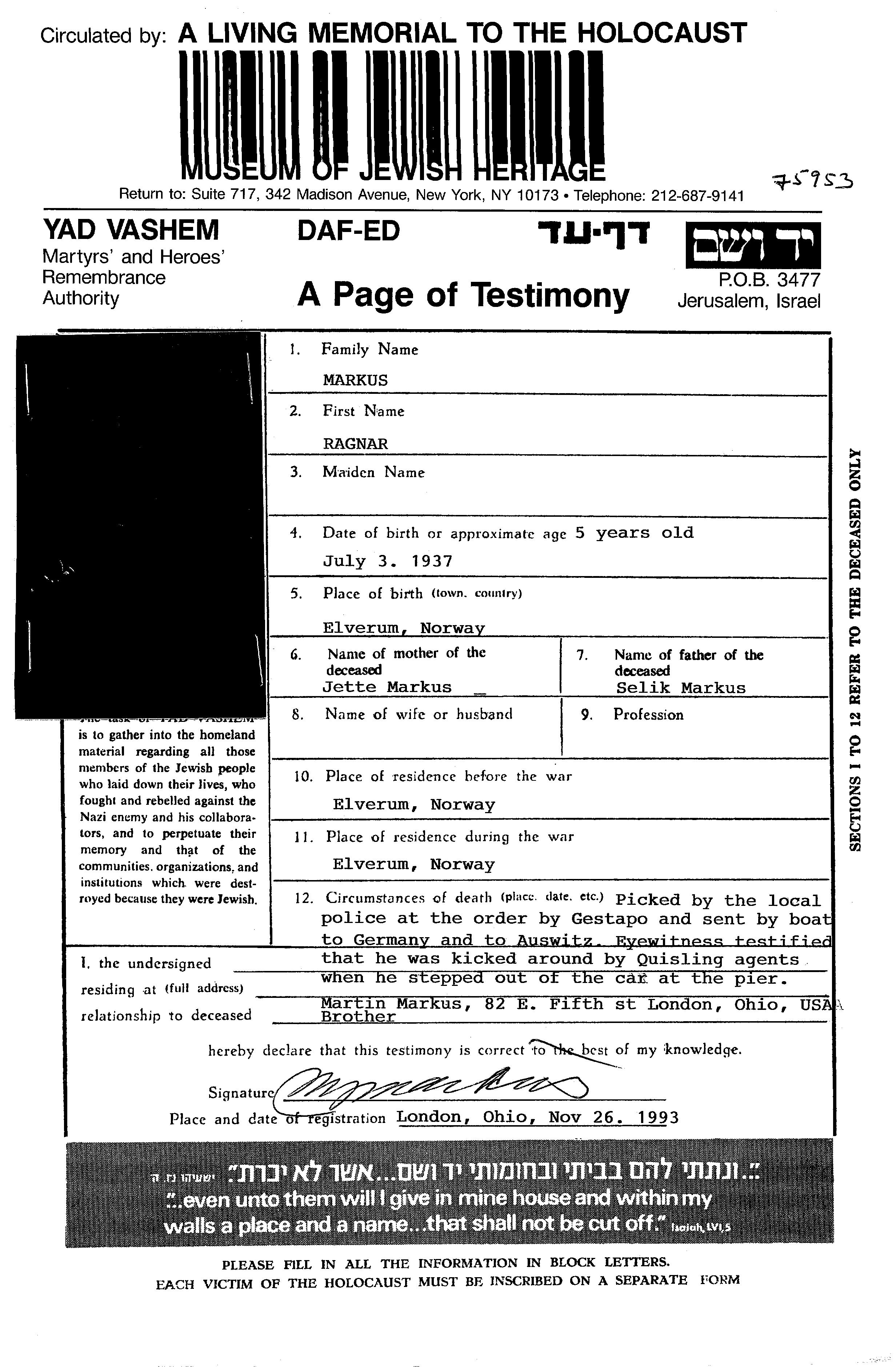 Markus Ragnar 1937 Elverum, Norvège Feuille de témoignage