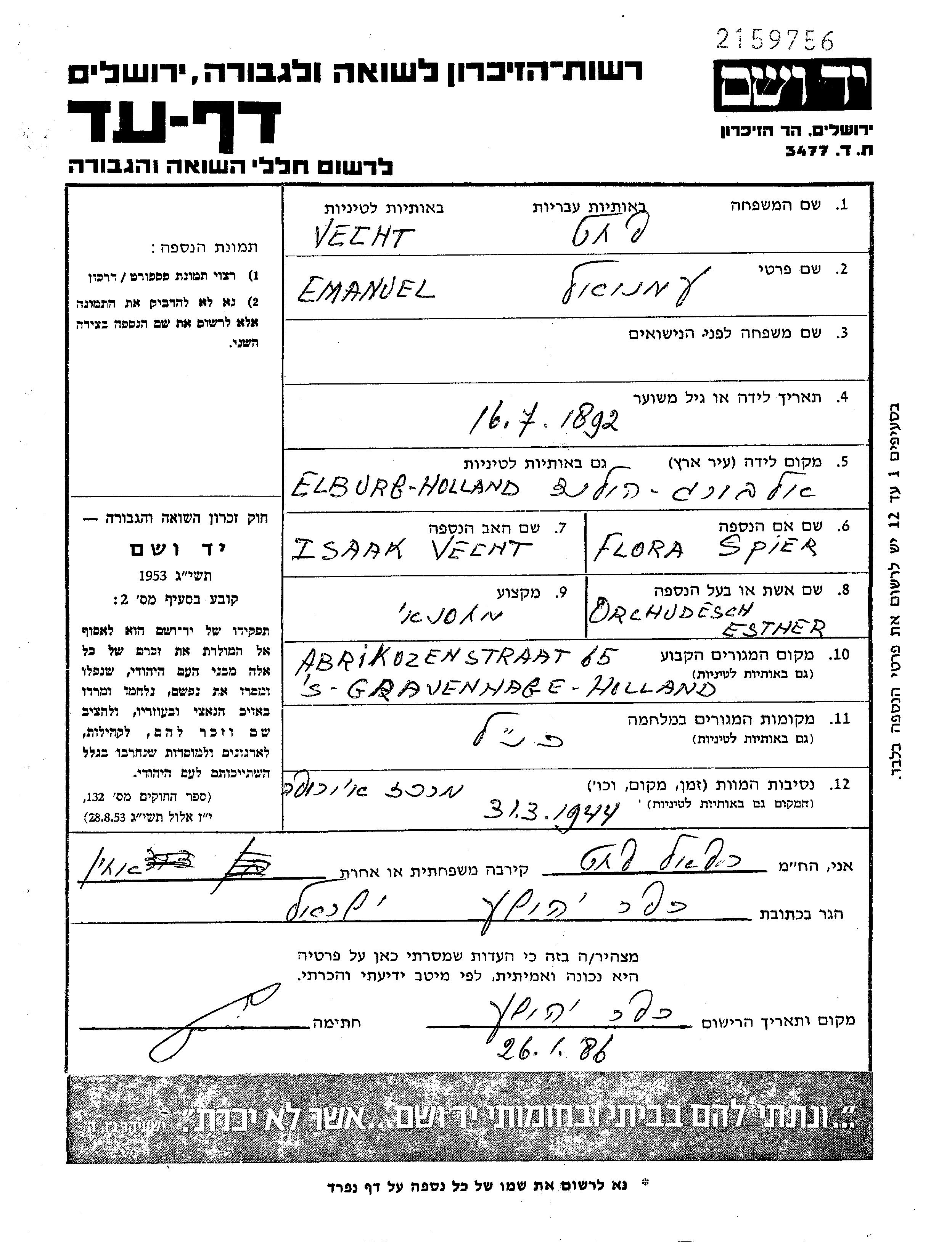 Emanuel Vecht Pekht est né à Elburg, Pays-Bas en 1892. Il était Manutentionnaire. Avant la seconde guerre mondiale il vivait à S Gravenhage, Pays-Bas.