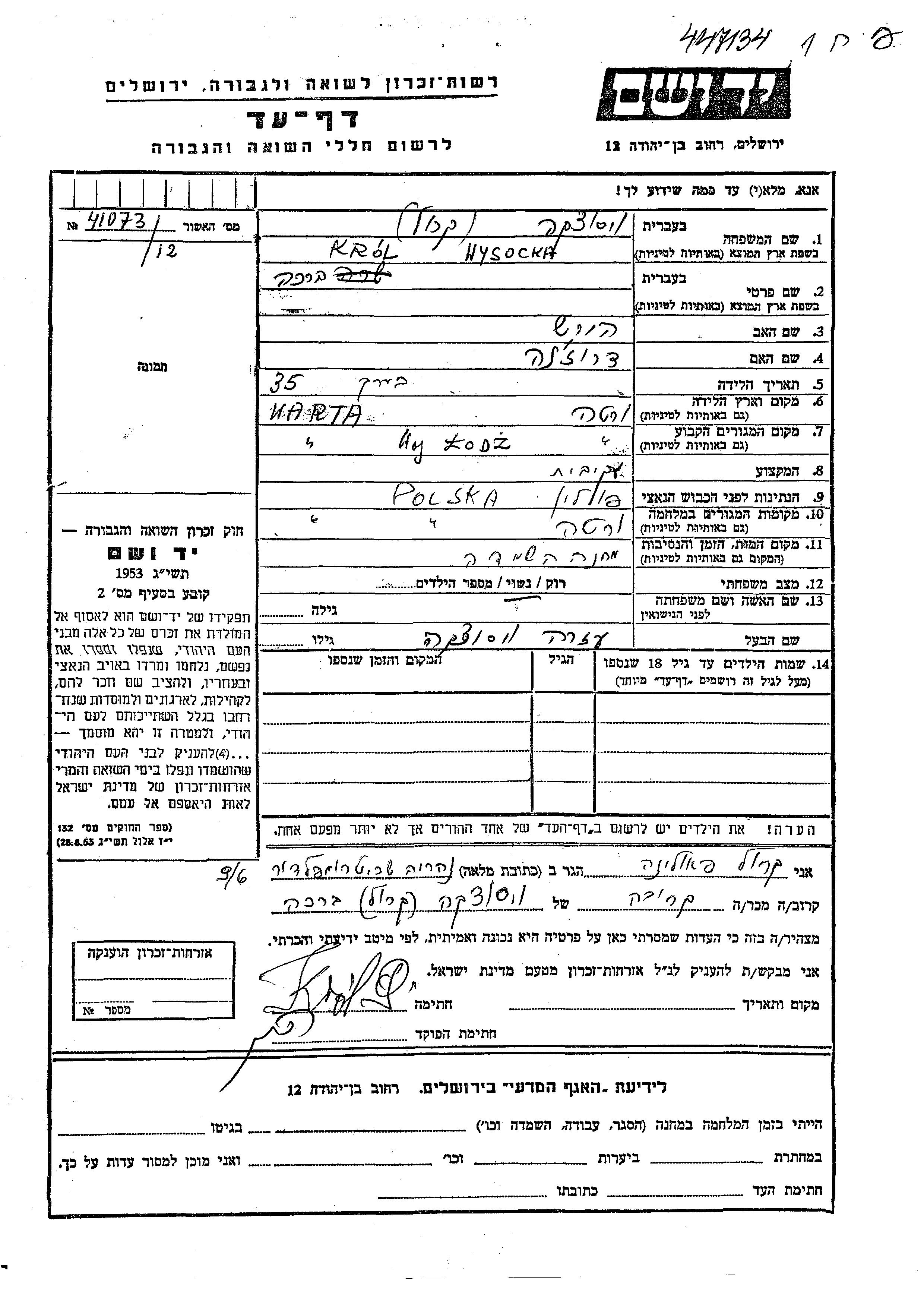 Wysocka Brakha Warta, Pologne Feuille de témoignage