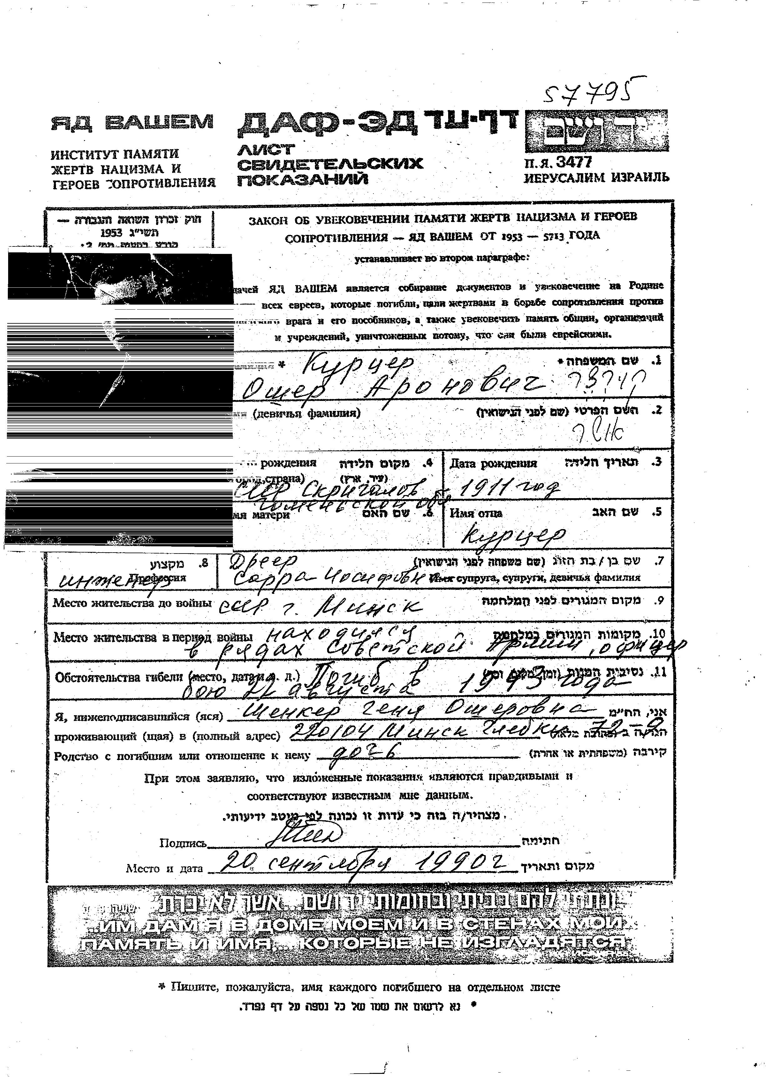 Kurtzer Osher 1910 Minsk, Bélorussie (URSS) Feuille de témoignage