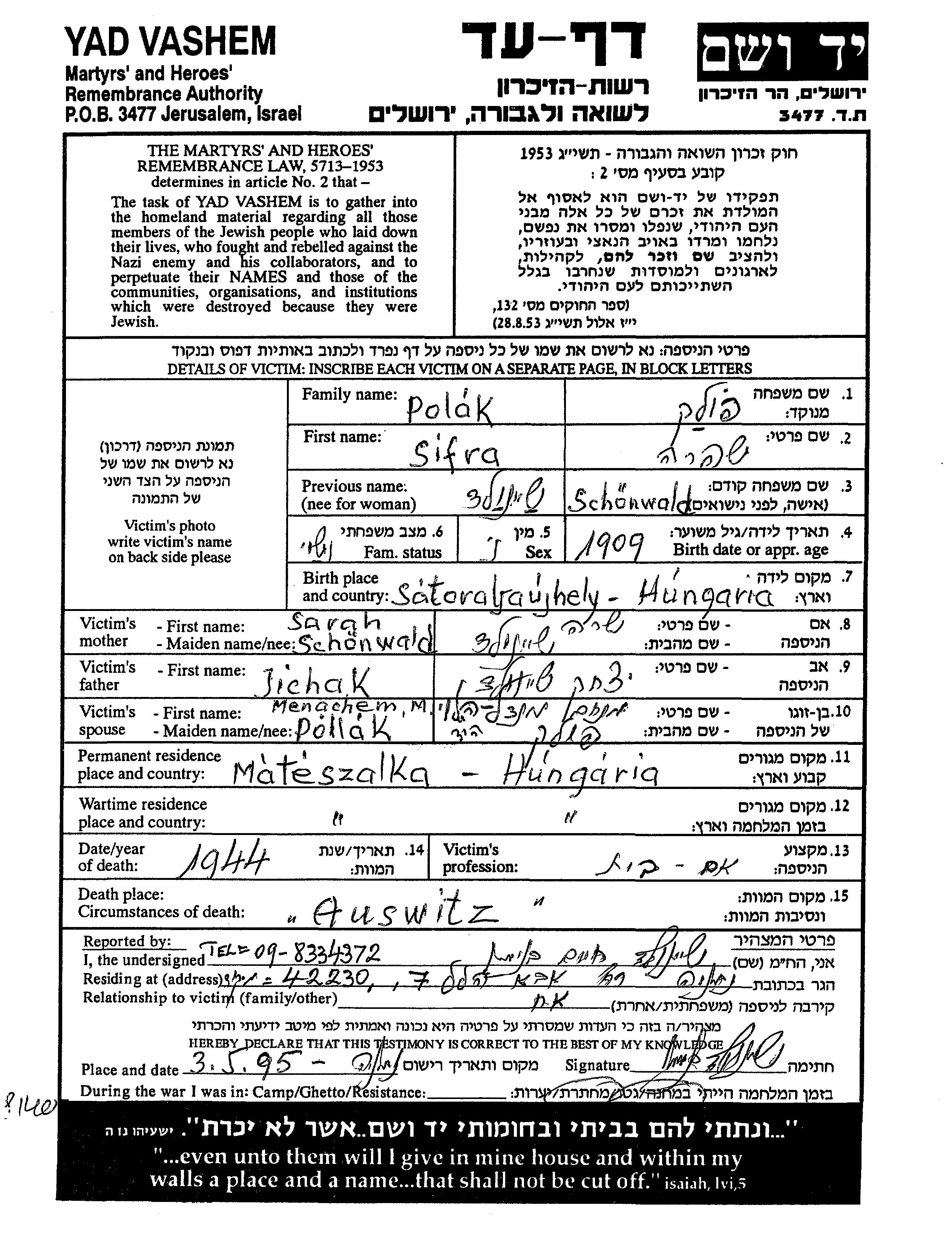 Polak | Shifra | 1909 | Mateszalka, Hongrie | Feuille de témoignage |