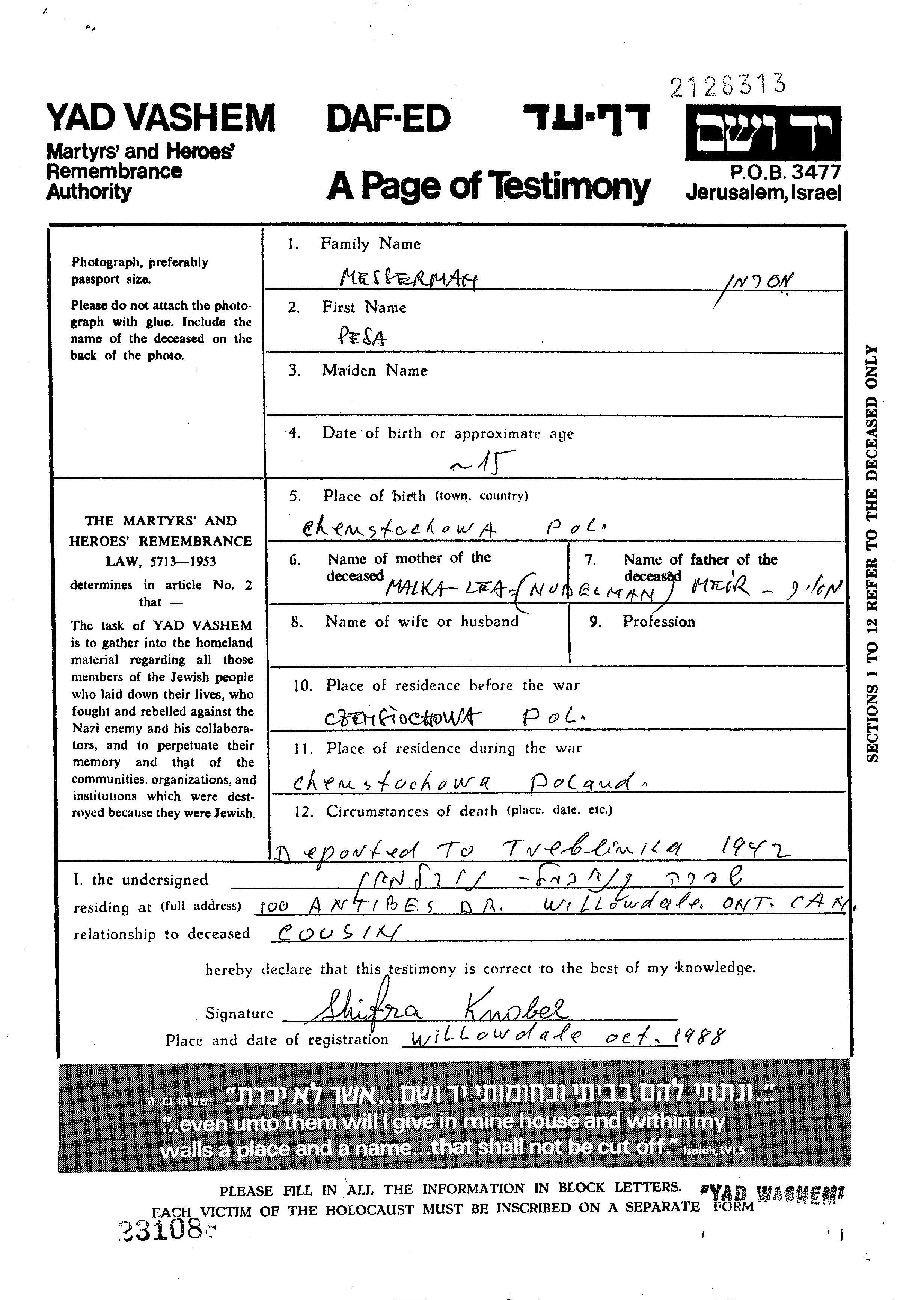Meserman Pese Chenstochov, Pologne Feuille de témoignage