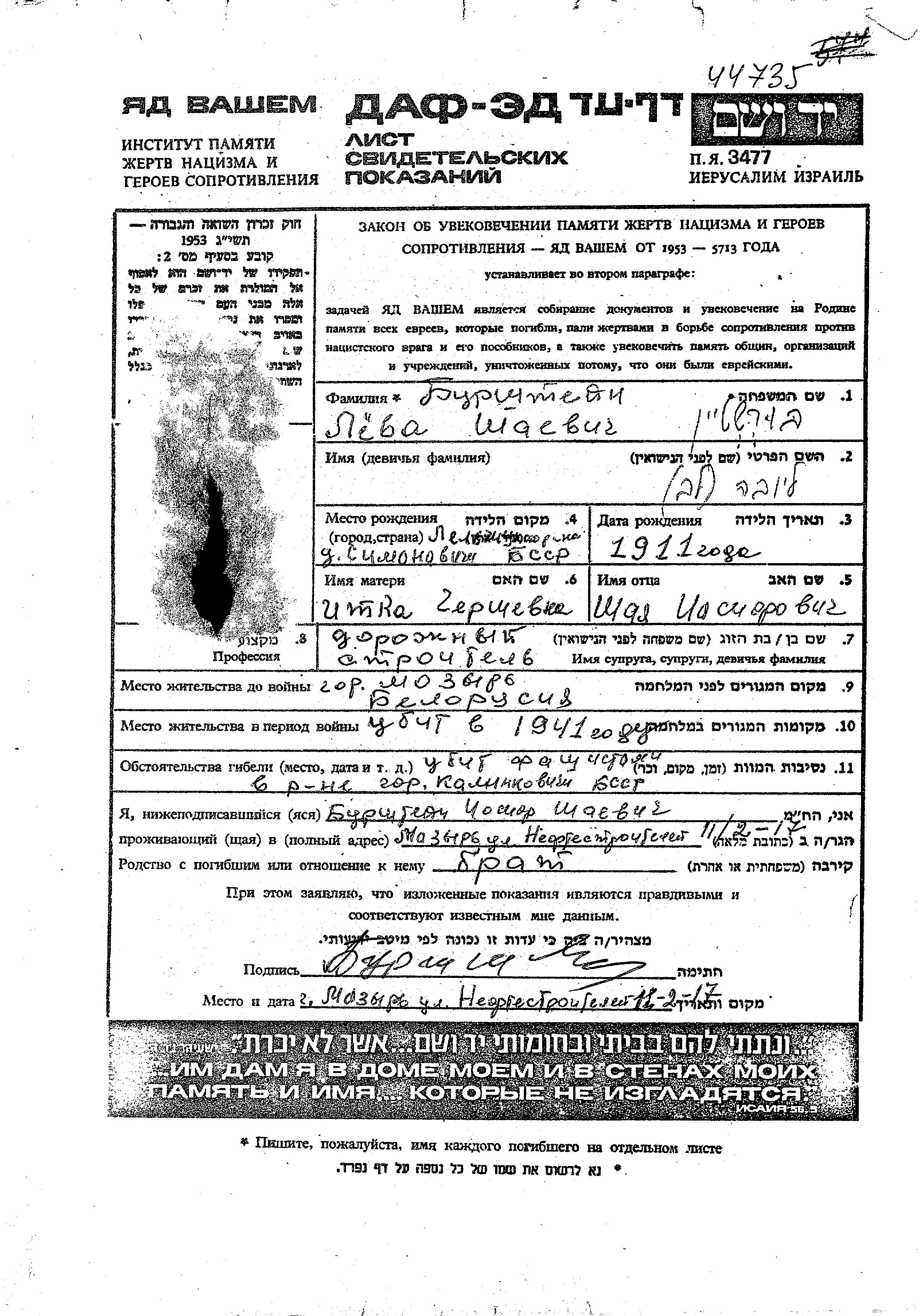 Burshtein Liova 1911 Mozyr, Bélorussie (URSS) Feuille de témoignage