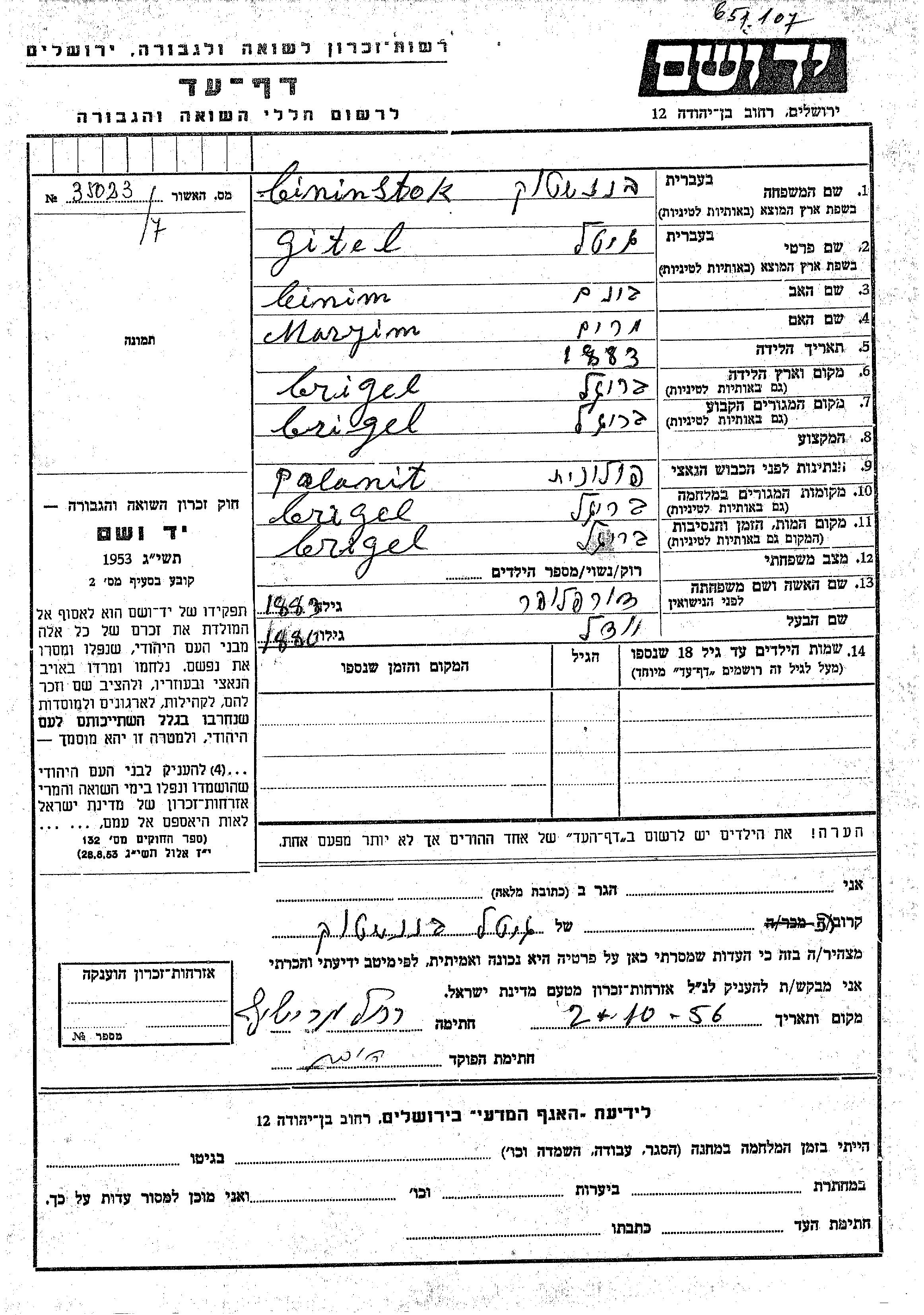 Yad Vashem - Pages of Testimony Names Memorial Collection