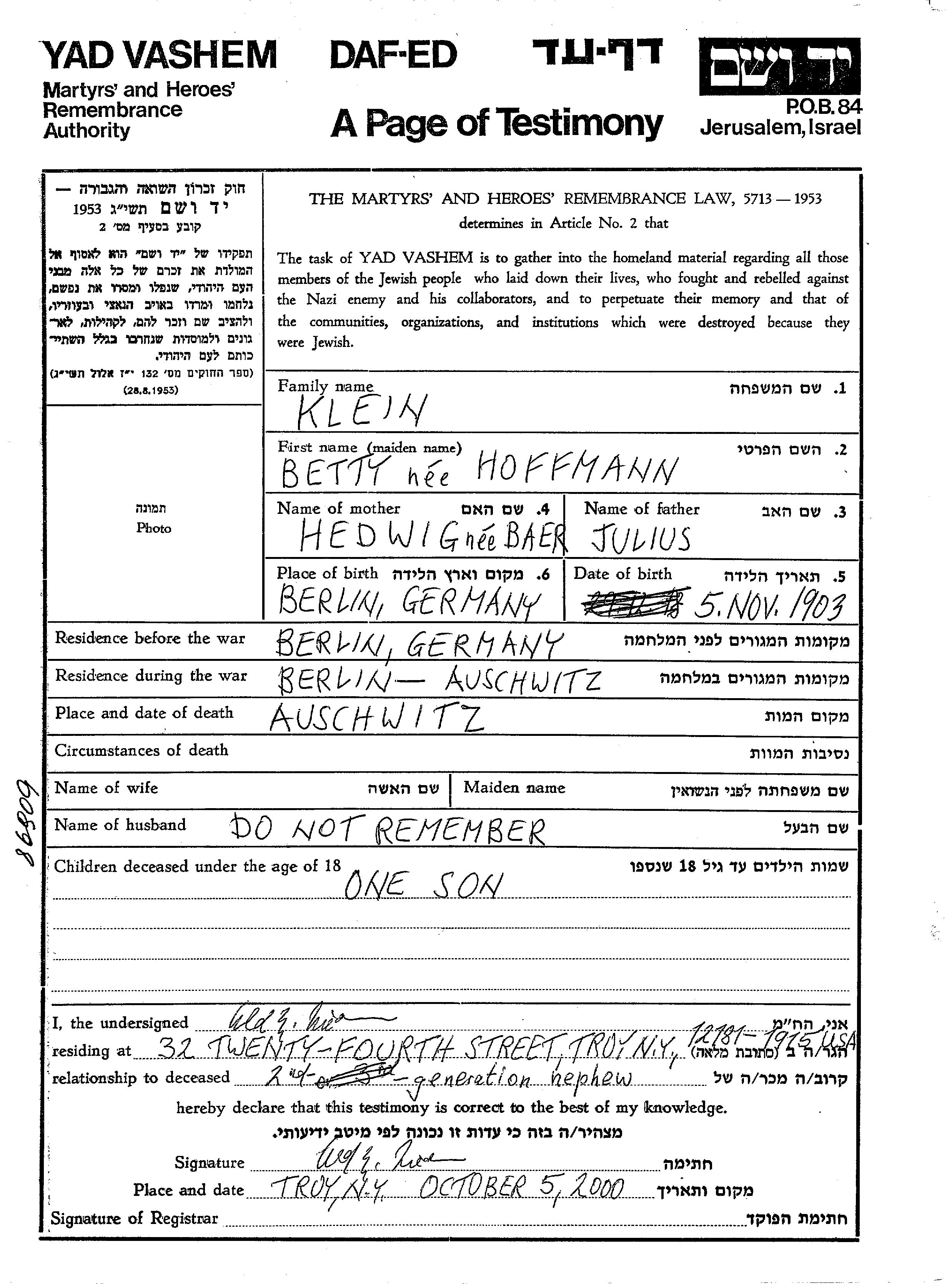 Klein Betty 1903 Berlin, Allemagne Feuille de témoignage